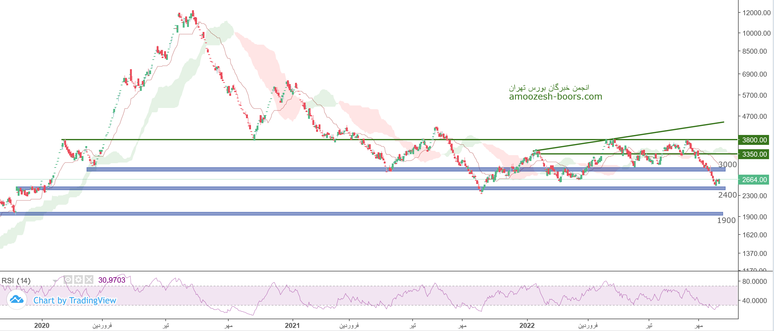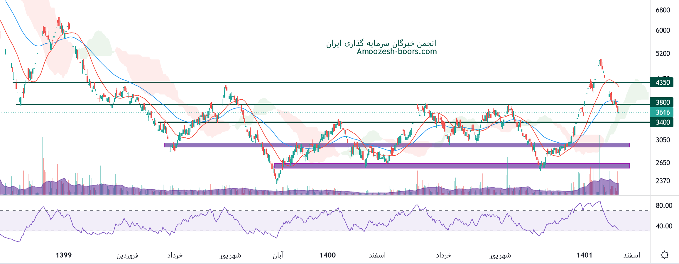 نماد خکرمان که در مسیر اصلاح خود حمایت 3800 ریال را از دست داده است، حمایت 3400 ریال را پیش رو دارد، در صورت تثبیت قیمت روی این محدوده حمایتی، حرکت سهم خکرمان تا 3800 و بعد از آن تا 4350 ریال محتمل خواهد بود، همچنین در صورت از دست رفتن این محدوده حمایتی، حمایت بعدی 3000 ریال در نظر گرفته خواهد شد.