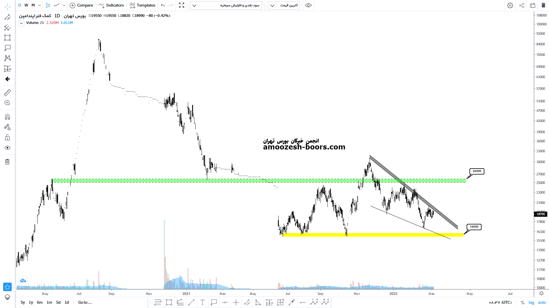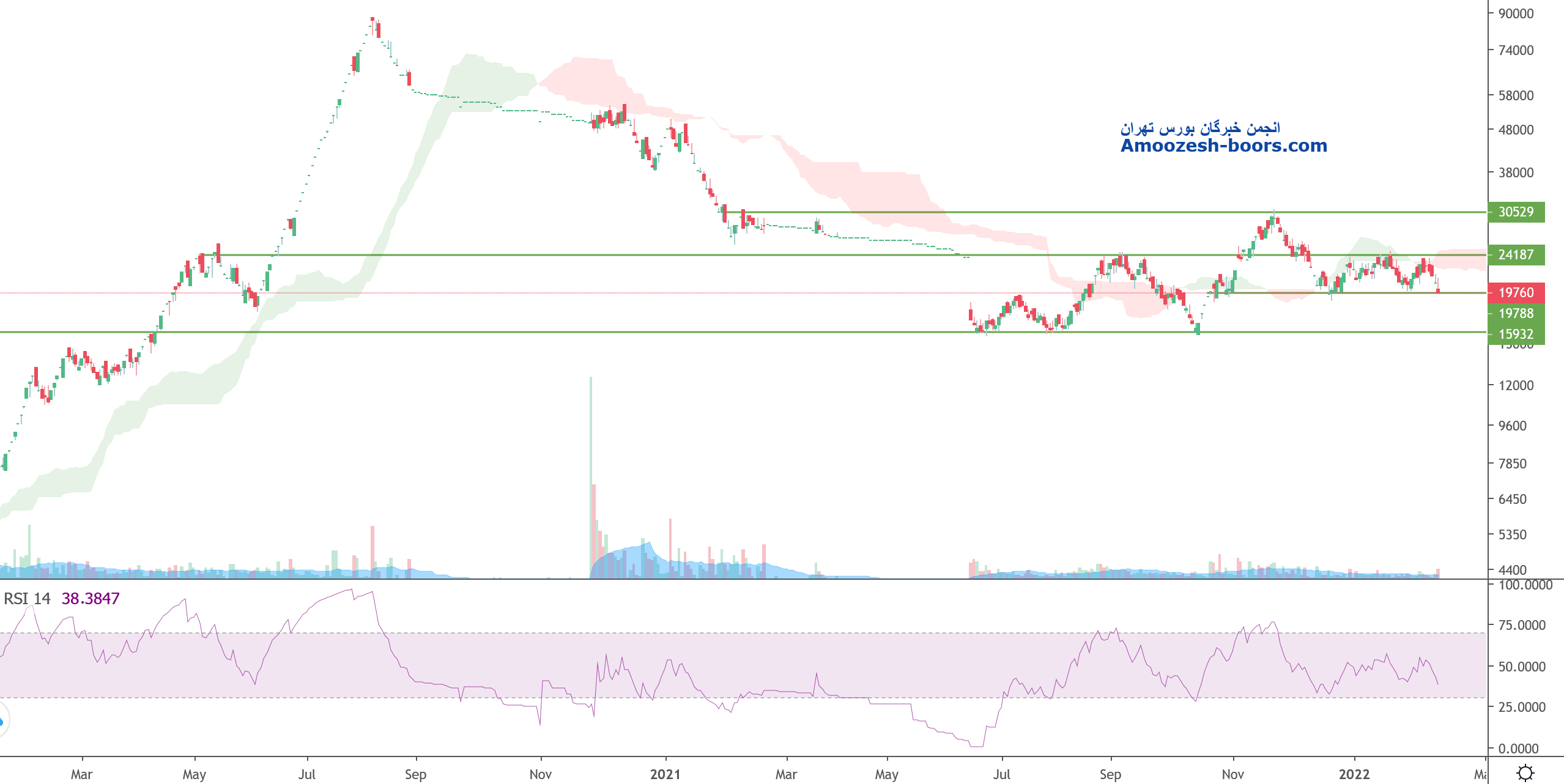 قیمت پس از رشد در چند روز اخیر به محدوده مقاومتی خط روند نزولی خود رسیده که در صورت شکست آن میتواند رشد خود را تا منفی مقاومتی ۲۶۰۰ تومان ادامه دهد اما در صورت بروز واکنش منفی به این محدوده مقاومتی و اصلاح مجدد در محدوده حمایتی ۱۶۰۰ تومان می تواند مجدداً تقاضای در سهم به وجود بیاید که باعث رشد قیمت شود.
