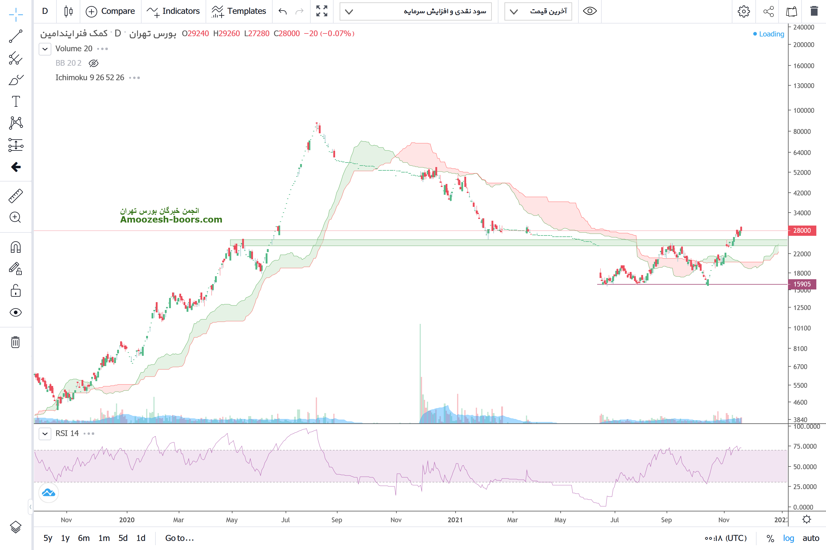 حمایت 20000 و مقاومت 24000 بر سر راه حرکتی سهم قرار دارد و تا زانیکه قیمت بالای 30000 تثبیت نشده ادامه حرکت ساید وی و عدم ایجاد ترند محتمل میباشد .