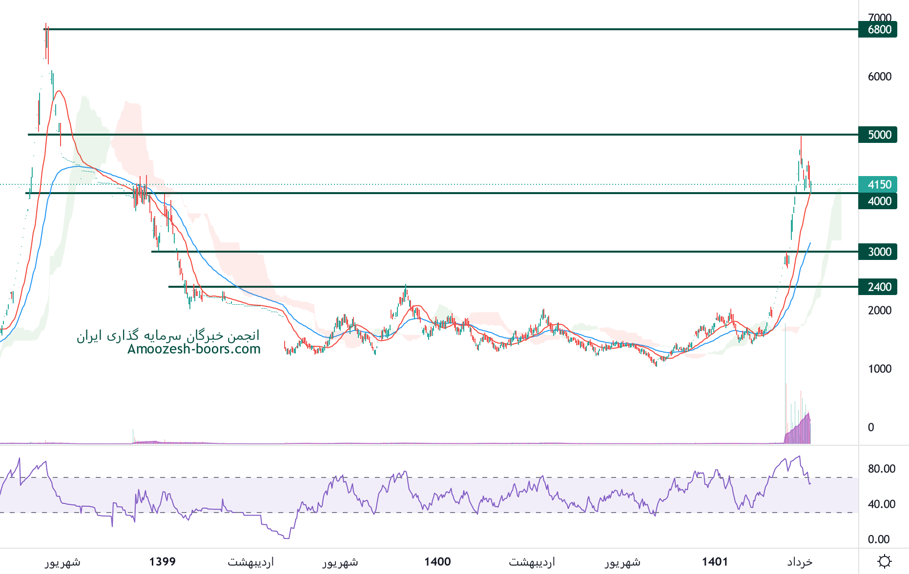 نماد خکمک در حال نوسان مابین سطح حمایتی 4000 ریال و سطح مقاومتی 5000 ریال میباشد، باید منتظر ماند که ببینیم قیمت از کدام سمت از این سطوح عبور میکند، در صورت از دست رفتن حمایت ذکر شده اصلاح قیمت سهم خکمک تا 3000 ریال ادامه دار خواهد بود، همچنین در صورت صعودی شدن سهم و عبور از سطح مقاومتی 5000 ریال تارگت سهم محدوده قله تاریخی در قیمت 6800 ریال خواهد بود.