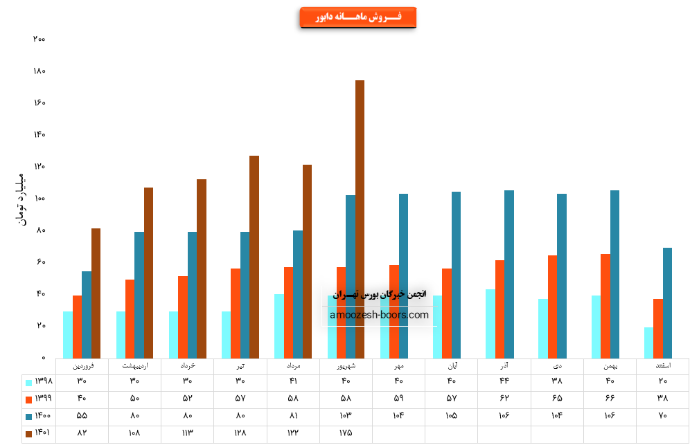 فروش نماد دابور: 303 میلیارد تومان که نسبت به دوره مشابه گذشته 41% افزایش یافته است.