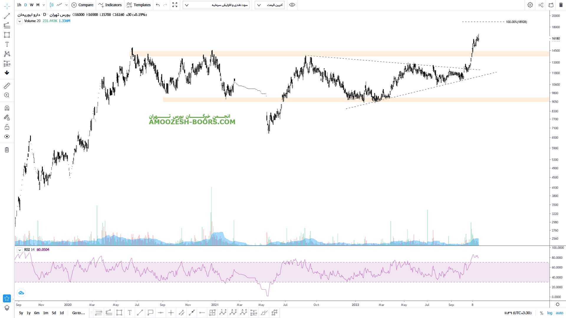 قیمت سهم دابور توانست پس از شکست و خروج از الگوی فشرده شده رشد همچنین با شکست سقف تاریخی مهم ناحیه ۱۴۰۰ تومان اکنون مقاومت مهم ناحیه ۱۹۰۰ تومان را پیش روی خود دارد که می تواند اصلاحی را از این ناحیه آغاز کند لذا ناحیه حمایتی ۱۴۰۰ تومان میتواند در صورت آغاز اصلاح از ریزش بیشتر قیمت جلوگیری کند.