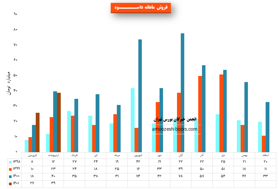 سهم داسوه در فروردین ماه ۱۴۰1 حدود مبلغ 26 میلیارد تومان درآمد داشته که این میزان در مقایسه با ماه گذشته 21% کاهش و همچنین در مقایسه با مدت مشابه سال گذشته 44% رشد درآمد پیدا کرده است.
