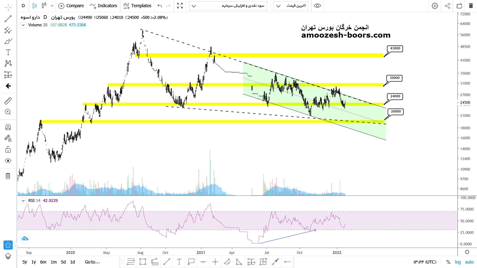 سهم داسوه با توجه به بروز واکنش منفی به مقاومت محدوده 3000 تومان، سهم مجددا به درون کانال نزولی خود بازگشته و اکنون بر روی حمایت 2400 تومان قرار دارد که درصورت واکنش مثبت میتواند مجددا به مقاومت خط روند نزولی و همچنین سقف کانال نزولی کوتاه مدت خود حمله ور شده و درصورت شکست،سیگنال صعود صادر و سهم داسوه تا 3000 تومان صعود خود را ادامه دهد