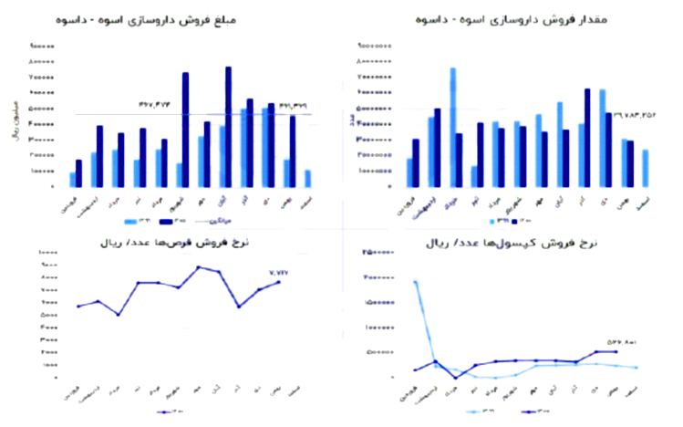 سهم داسوه در این ماه 62 میلیون انواع قرص بفروش رسانده است. مقدار فروش نسبت به آبان ماه68 درصد رشد نشان می دهد اما نرخ 33 درصد کاهش داشته است. نسبت به متوسط ماههای قبل، 66 درصد افزایش مقدار و 20 درصد کاهش نرخ فروش را شاهدیم.