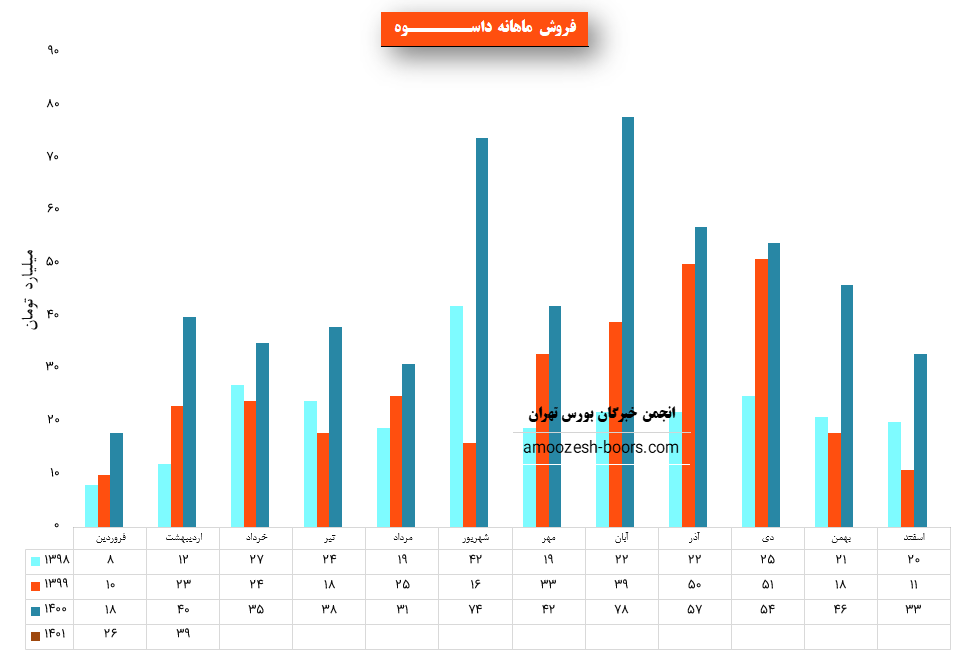 سهم داسوه در آذر ماه موفق به فروش 571 میلیارد شده است. این رقم 20 درصد بیشتر از میانگین درآمد فصل تابستان و 27 درصد کمتر از فروش آبان ماه است.