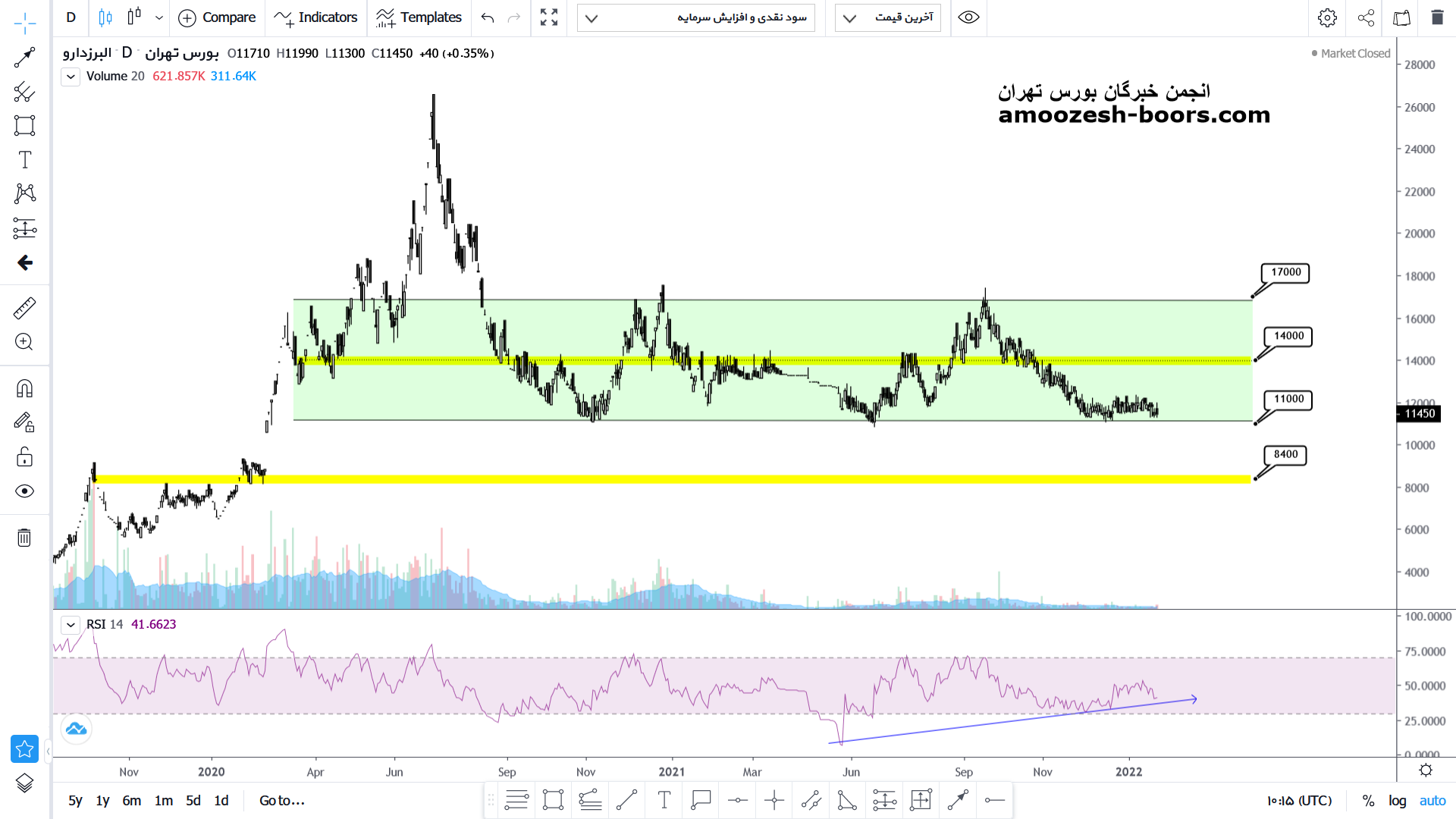 درصورت حمایت از این محدوده (محدوده حمایتی 1100 تومان)میتواند به ترتیب تا محدوده مقاومت میدلاین کانال (محدوده 1400تومان ) و در صورت شکست تا محدوده سقف کانال (محدوده 1700 تومان )نیز میتواند رشد خود را ادامه دهد.
