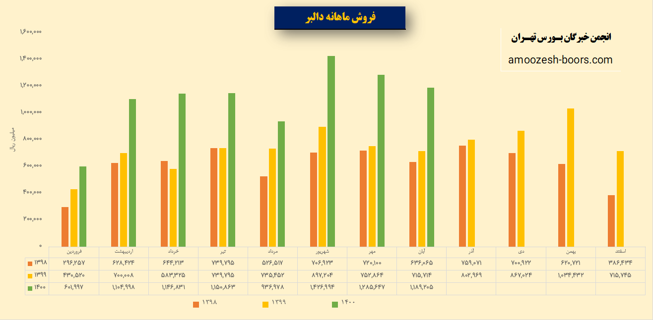 فروش سهم دالبر در آذر ماه با افزایش 9 درصدی در مقایسه با آبان ماه به 1.301 میلیارد ریال رسیده است. لازم به ذکر است این مقدار به نسبت میانگین فروش تابستان با تغییر مثبت 11 درصدی همراه بوده است.