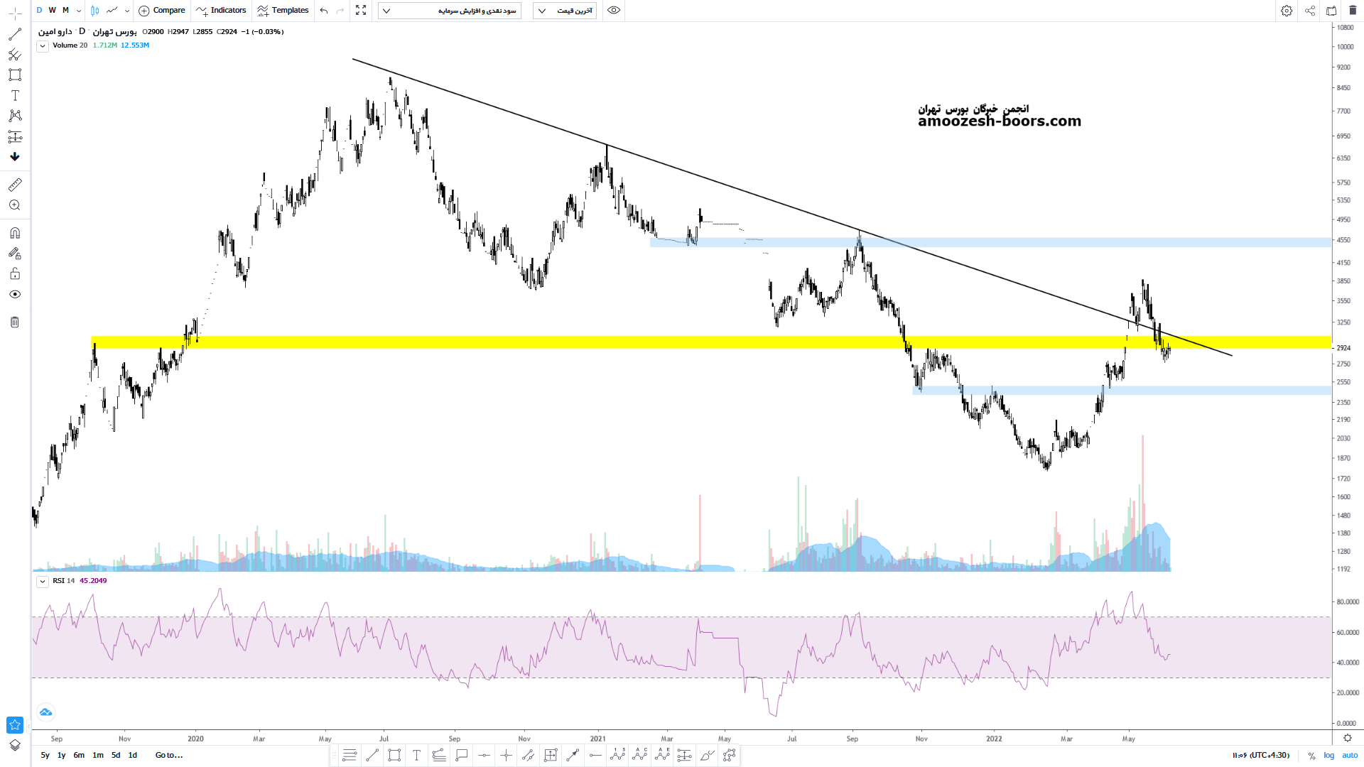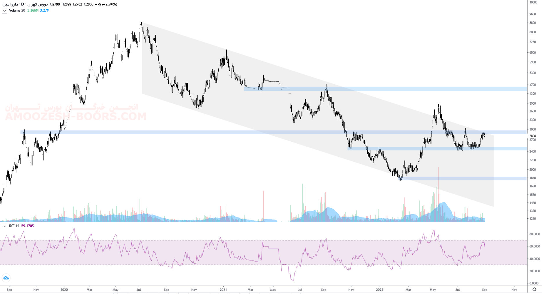 قیمت سهم دامین پس از خروج ناموفق از کانال نزولی و عدم توانایی قیمت در تثبیت مجدد به درون کانال بازگشت کرده و با شکست ناحیه حمایتی ۲۹۰ تومان به سمت ناحیه حمایتی ۲۵۰تومان حرکت کرده و کف مهمی را در این ناحیه ایجاد کرده است لذا در صورت شکست مقاومت ناحیه ۲۹۰ تومان و همچنین سقف کانال نزولی و تثبیت شکست سیگنال ورود صادر و قیمت سهم دامین می تواند تا مقاومت ناحیه ۳۹۰ تومان و در صورت شکست تا مقاومت ناحیه ۴۶۰ تومان نیز رشد خود را ادامه دهد اما در صورت از دست رفتن حمایت ناحیه ۲۴۰ تومان قیمت میتواند اصلاح خود را تا کف ۱۸۵ تومان نیز ادامه دهد.
