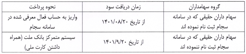 با توجه به الزام پرداخت سود سهامداران از طریق شرکت سپرده گذاری مرکزی اوراق بهادار و تسویه وجوه به موجب قانون بودجه سال ۱۴۰۱ و ابلاغیه سازمان بورس و اوراق بهادار تهران لازم است سهامداران محترم قبل از تاریخ یاد شده در سامانه سجام ثبت نام نمایند. در مورد سهامداران حقوقی به وسیله چک و طبق توافق فی مابین پرداخت خواهد گردید.