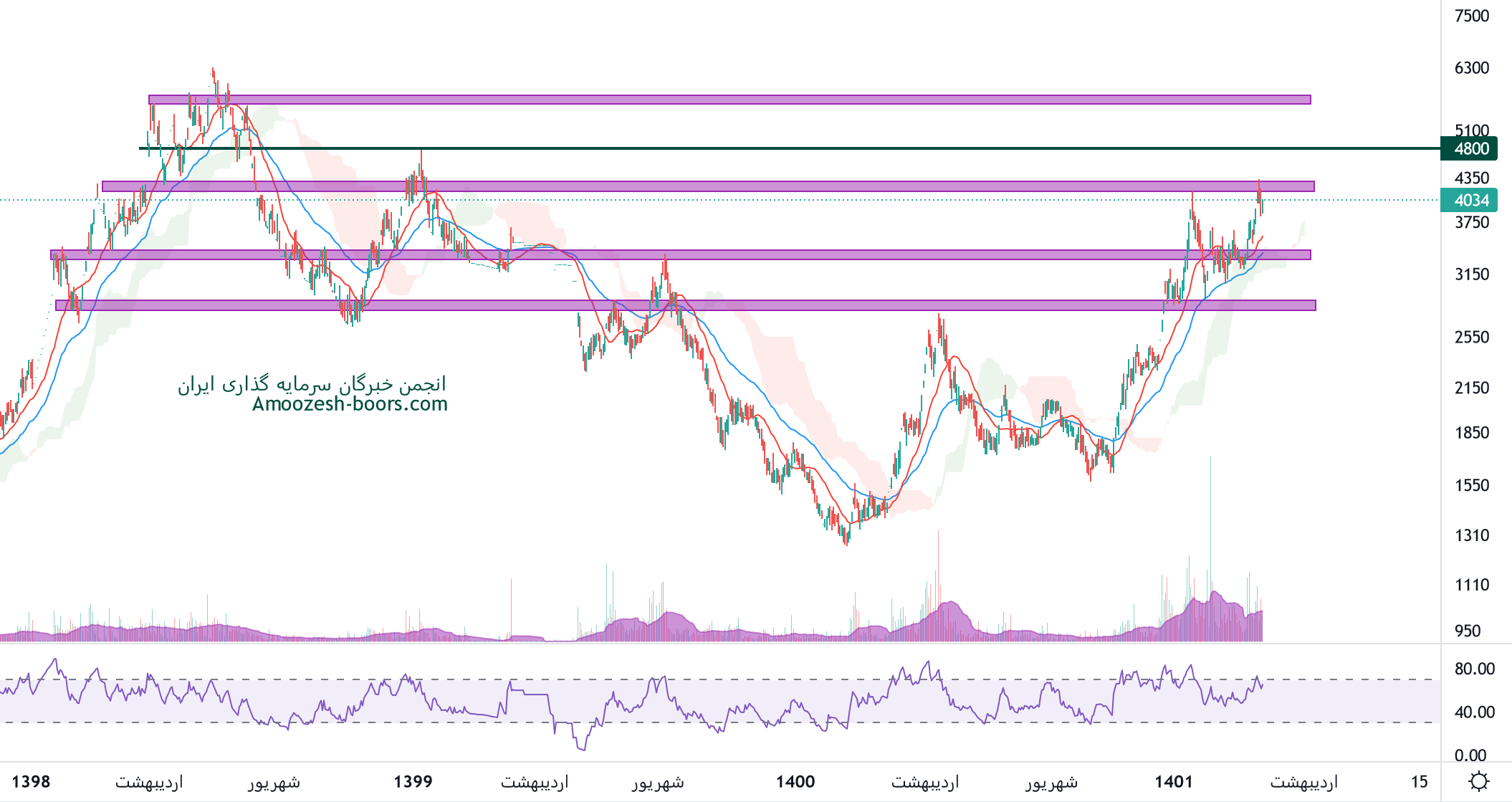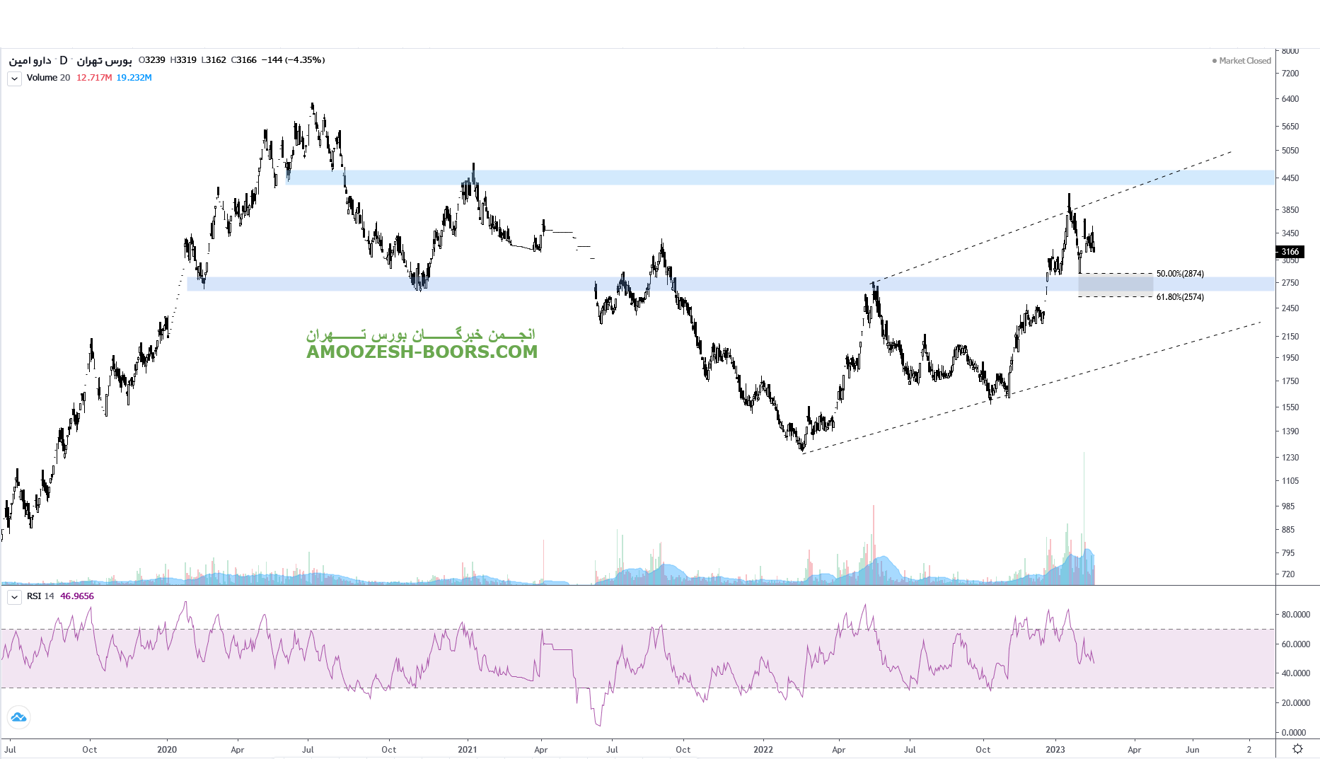 نماد دامین محدوده مقاومتی پر ریسک 4200 ریال را دارا میباشد، در صورت ادامه دار شدن روند صعودی و افزایش میزان تقاضا و عبور از این سطح مقاومتی، حرکت سهم دامین تا 4800 ریال محتمل خواهد بود، همچنین در صورت ورود سهم به فاز اصلاحی، اولین حمایت 3300 ریال ارزیابی میگردد.