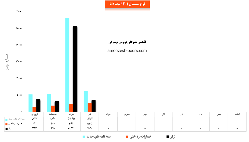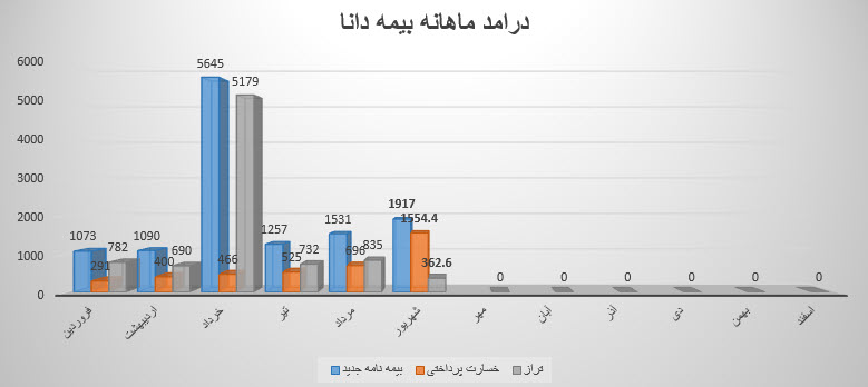 سهم دانا (بیمه دانا) در عملکرد شهریور ماه خود مبلغ 1,917 میلیارد تومان از محل فروش حق بیمه درآمد و همچنین مبلغ 1,554.4 میلیارد تومان به عنوان خسارت پرداختنی داشته است. شرکت در این دوره تراز مثبت 362.6 میلیارد تومان (24%) را ثبت کرده است. تراز دانا در این دوره نسبت به ماه قبل 57% کاهش و نسبت به میانگین ماه های قبل 16% افزایش داشته است. دانا نسبت به دوره 1 ماهه مشابه سال قبل 5% کاهش تراز داشته است.