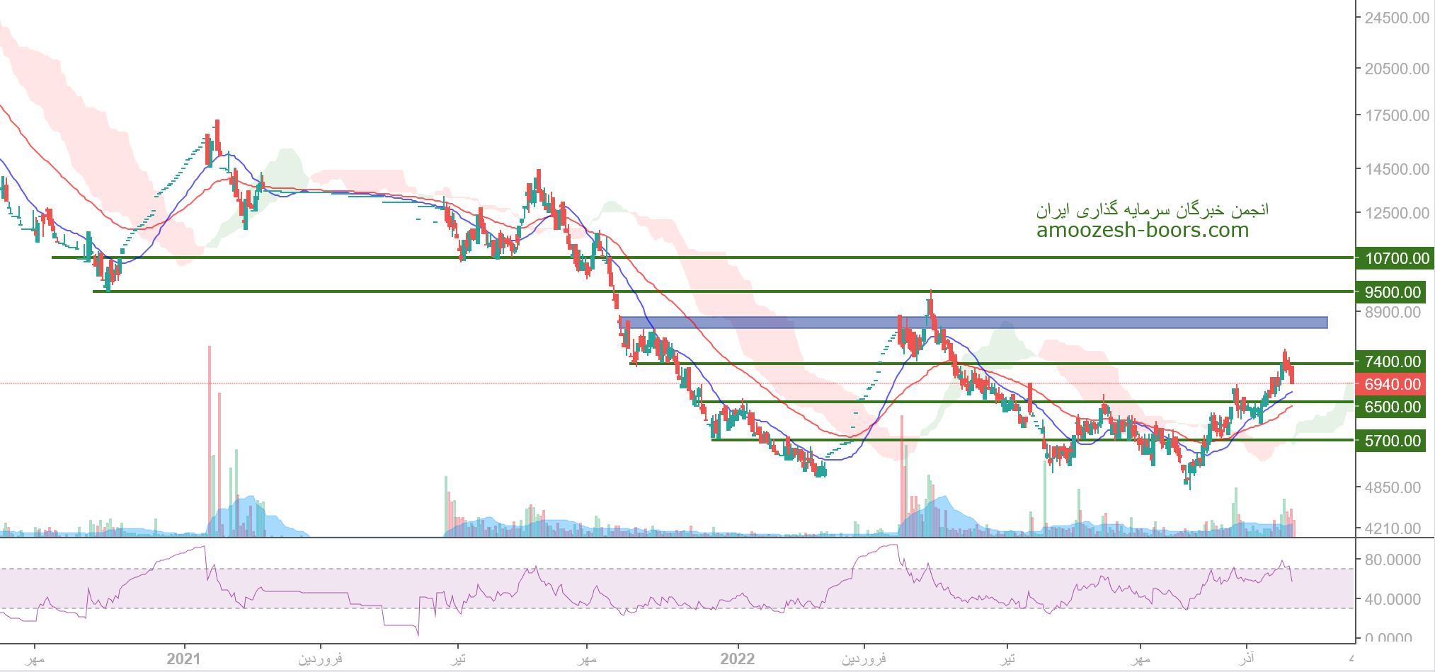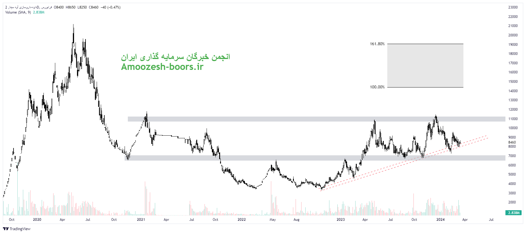 نماد داوه در حال اصلاح به سمت حمایت 6500 ریال میباشد، که این محدوده برای ورود پله ای منطقی به نظر میرسد، در صورت تثبیت قیمت روی این محدوده حرکت سهم تا 7400 و 8700 ریال دور از ذهن نمیابشد، همچنین در صورت از دست رفتن این حمایت، حمایت بعدی 5700 ریال ارزیابی میگردد.