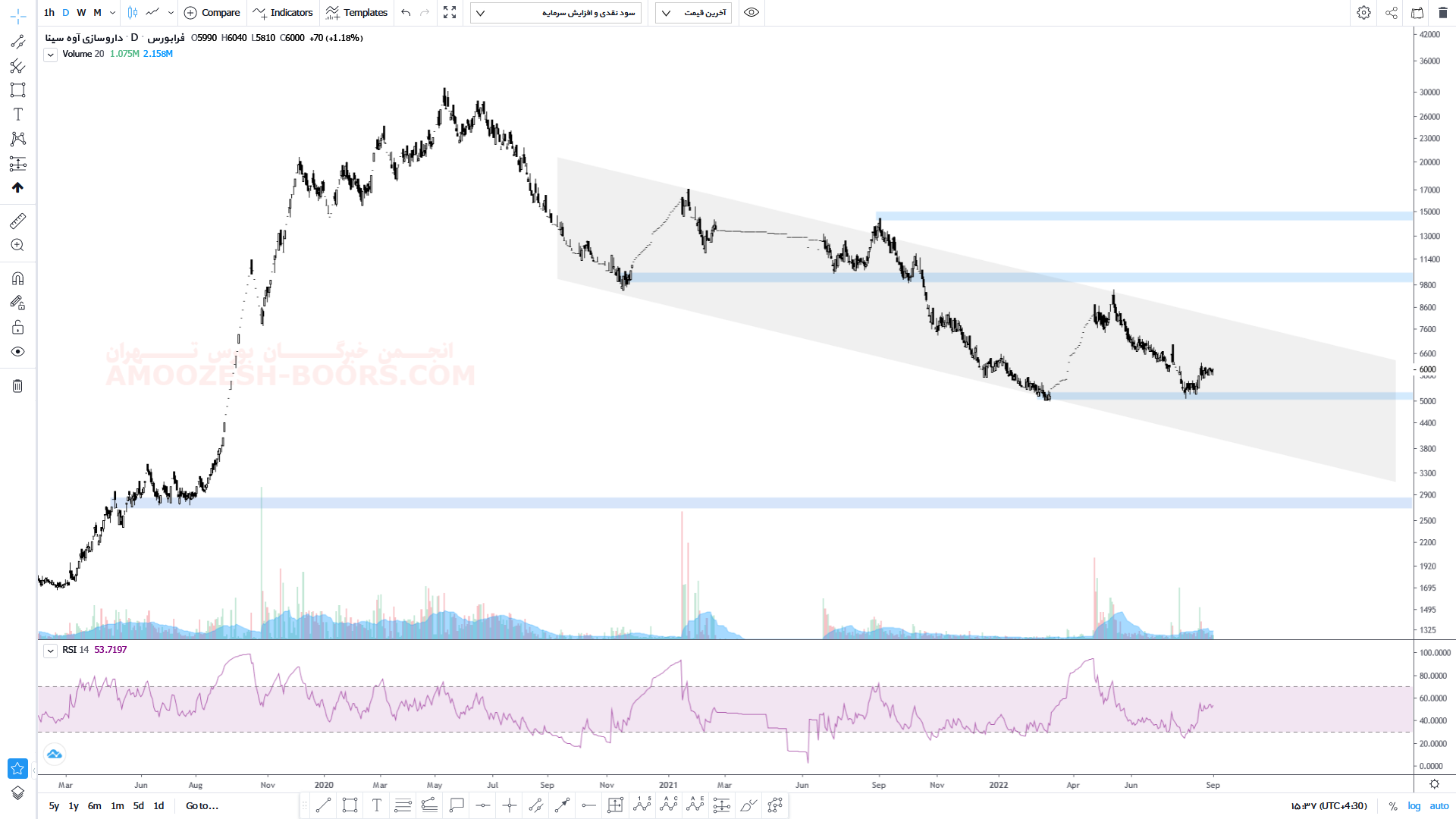 قیمت سهم داوه پس از از نزول و برخورد به ناحیه حمایتی ۵۰۰ تومان واکنش مثبتی را از خود بروز داده و در حال حرکت به سمت ناحیه مقاومتی مهم سقف کانال نزولی می باشد تا بتواند با شکست آن رشد خود را به سمت ناحیه مقاومتی هزار تومان نیز ادامه دهد. شرایط برگشت مجدد و از دست دادن حمایت ناحیه ۵۰۰ تومان اصلاح قیمت تا ناحیه کف کانال نزولی ادامه پیدا خواهد کرد.