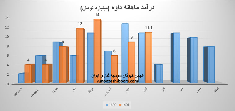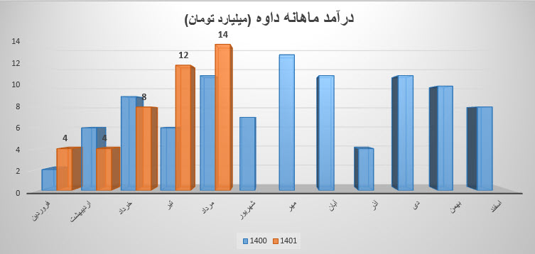 سهم داوه در دوره یک ماهه منتهی به 31 مرداد ماه 1401، مبلغ 14 میلیارد تومان درآمد داشته که نسبت به ماه قبل 14% افزایش و نسبت به میانگین ماه های قبل 123% افزایش داشته است.