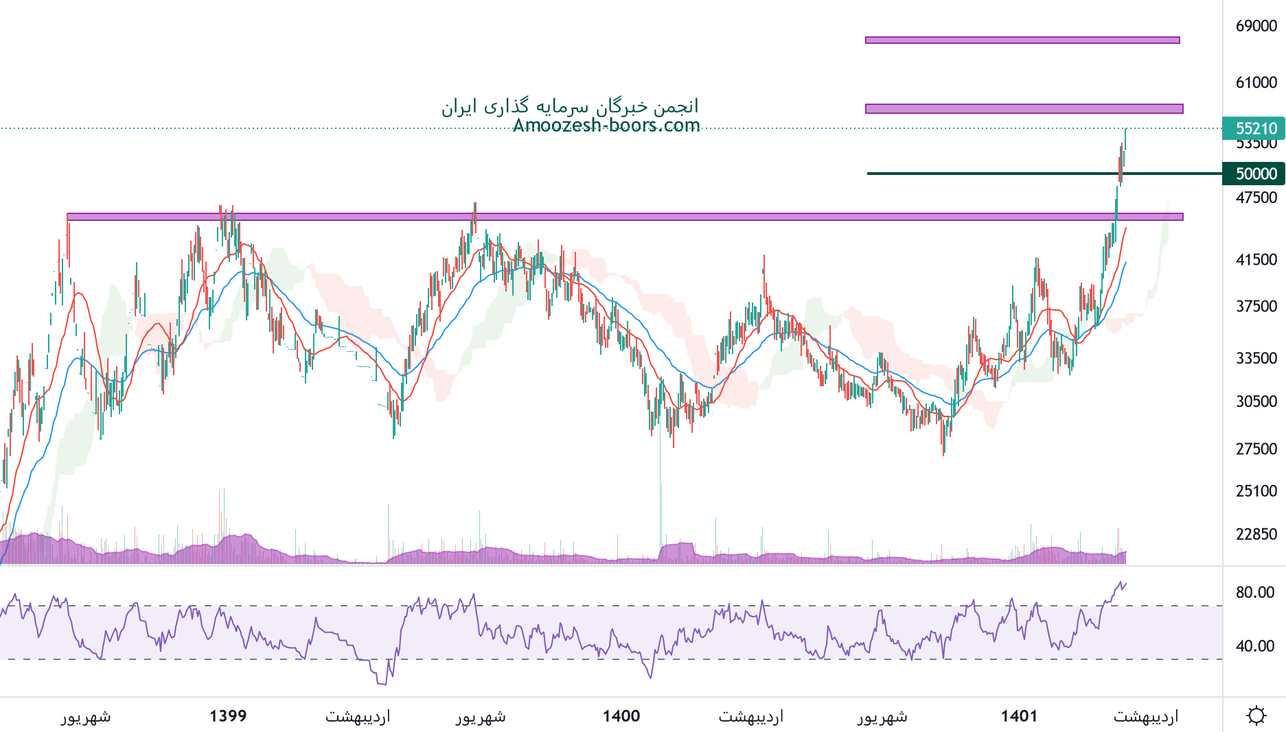 نماد دتماد با حرکت صعودی پر قدرت خود موفق به عبور از مقاومت های سقف تاریخی 45000 ریال و 50000 ریال شده و در حال حاضر نزدیک محدوده مقاومتی 58000 ریال میباشد، در صورت تمایل برای ورود به این نماد میتوانید به صورت پله روی حمایت 50000 ریال و یا بعد از شکست محدوده مقاومتی 58000 ریال اقدام کنید، در صورت عبور قیمت سهم دتماد از محدوده مقاومتی، حرکت این سهم تا 67000 ریال محتمل خواهد بود.