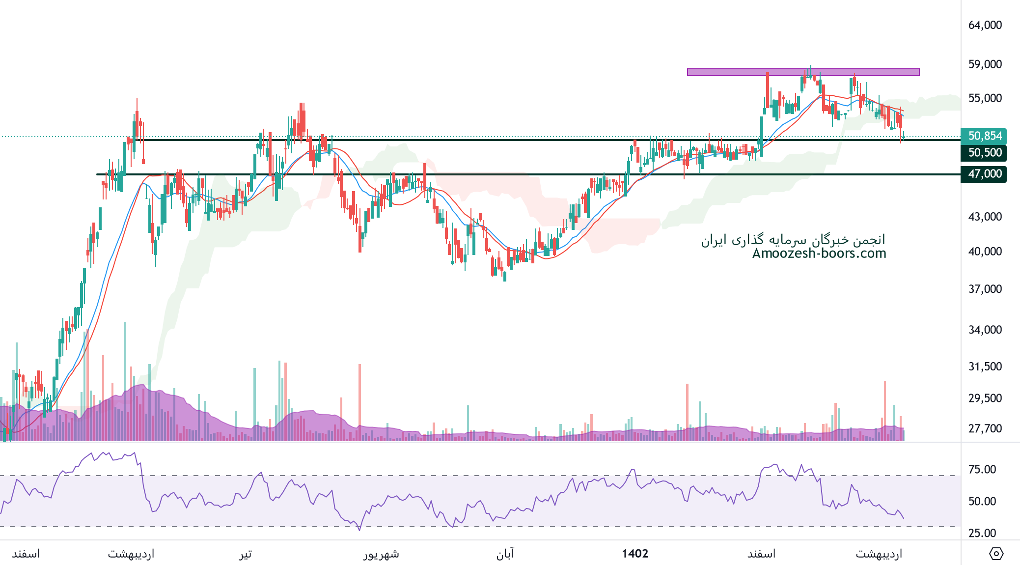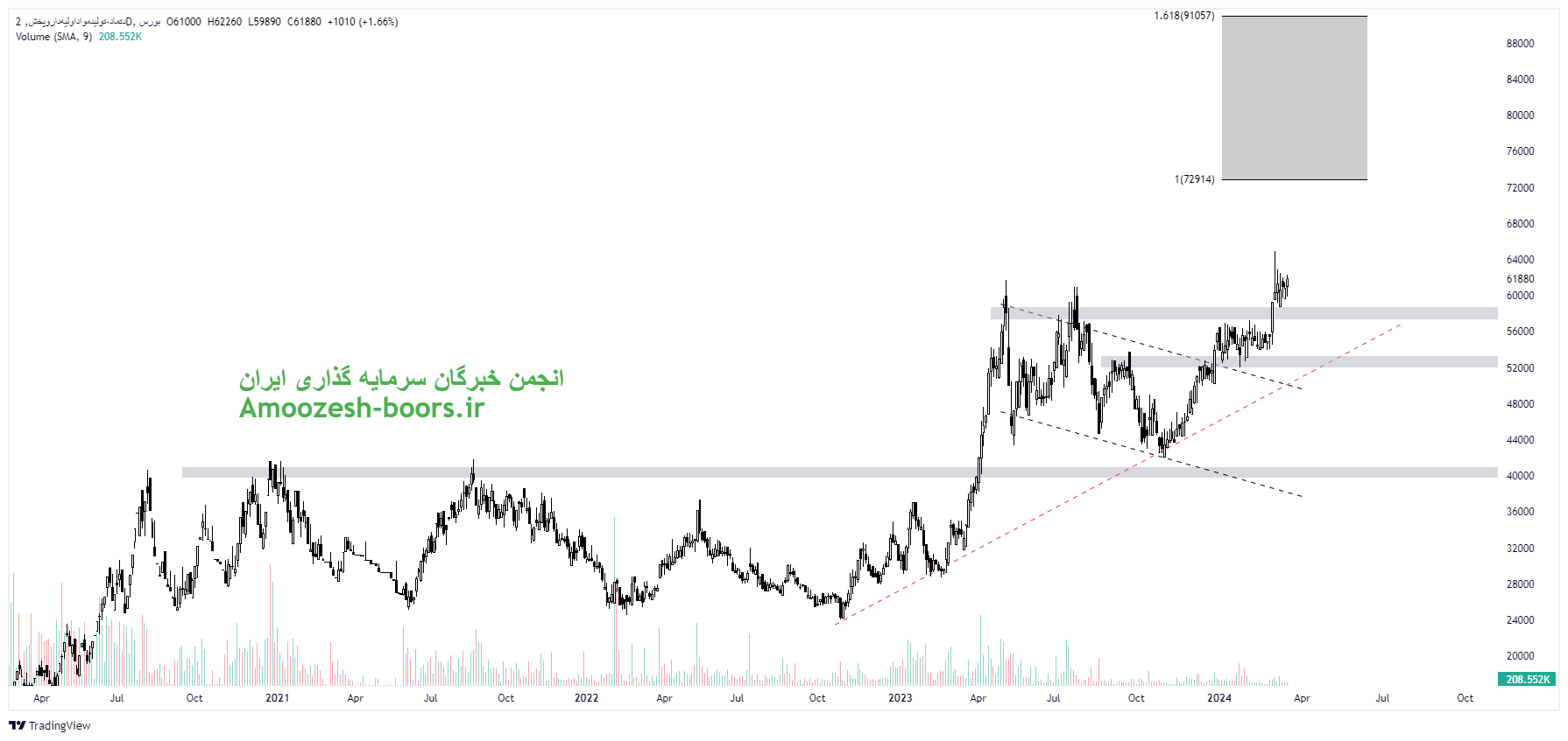 نماد دتماد به مقاومت محدوده 60000 ریال رسیده، در صورت عبور قیمت از این محدوده، مقاومت بعدی دتماد 70000 ریال در نظر گرفته خواهد شد، همچنین در صورت ورود قیمت به فاز اصلاحی، اولین حمایت سهم دتماد محدوده 49000 ریال ارزیابی خواهد شد.