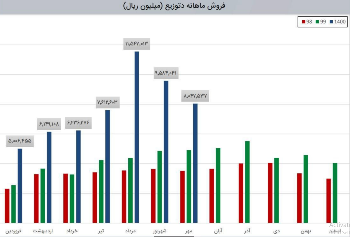 سهم دتوزیع طی عملکرد 1 ماهه منتهی به 1400/05/31 معادل 11,547,013 میلیون ریال از محصولات خود را به فروش رسانده که نسبت به دوره 1 ماهه مشابه سال قبل 163% افزایش داشته است.