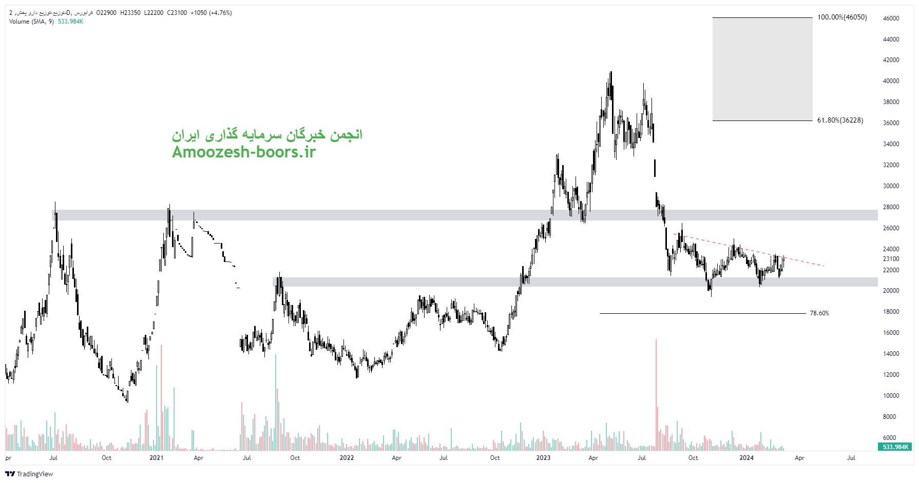 سهم دتوزیع با برخورد به ناحیه حمایتی ۲۱۰۰ تومان نوسان مثبتی را تجربه کرده است لذا در صورت ایجاد تقاضا در کلیت بازار و عبور از خط روند نزولی، مقاومتهای پیش روی سهم دتوزیع به ترتیب نواحی ۲۷۰۰، ۳۶۰۰ و ۴۶۰۰ تومان در میان مدت در نظر گرفته خواهند شد. همچنین در صورت برگشت مجدد مهمترین حمایت سهم دتوزیع ناحیه ۱۷۰۰ تومان در نظر گرفته خواهد شد.