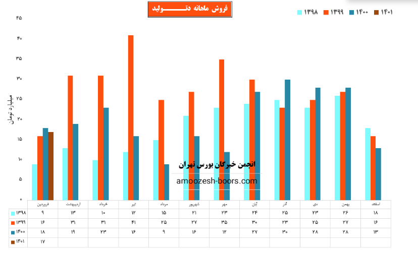 سهم دتولید طی عملکرد 1 ماهه منتهی به 1400/11/30 معادل 280,302 میلیون ریال از محصولات خود را به فروش رسانده است که نسبت به دوره 1 ماهه مشابه سال قبل 4% افزایش داشته است همچنین 2243 میلیارد ریال مجموع فروش 11ماهه بوده که نسبت به مدت مشابه سال قبل که 3112 میلیارد ریال بود 28 درصد کمتر است .باید در نظر داشت شرکت در مرحله اول وپیشنهاد هیئت مدیره در خصوص افزایش سرمایه 41 درصدی از محل آ ورده نقدی میباشد .