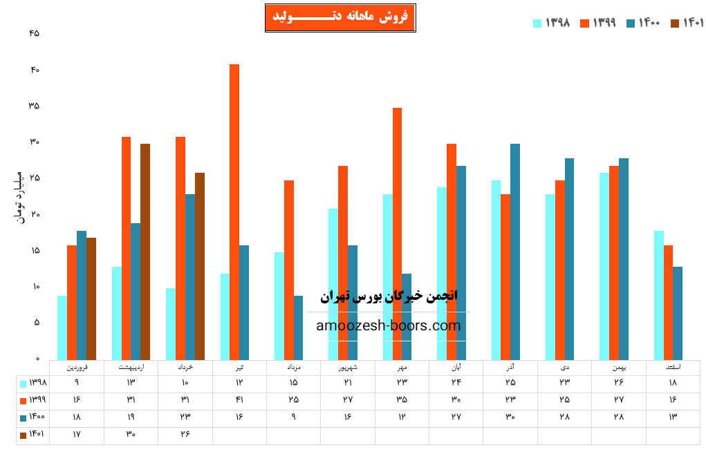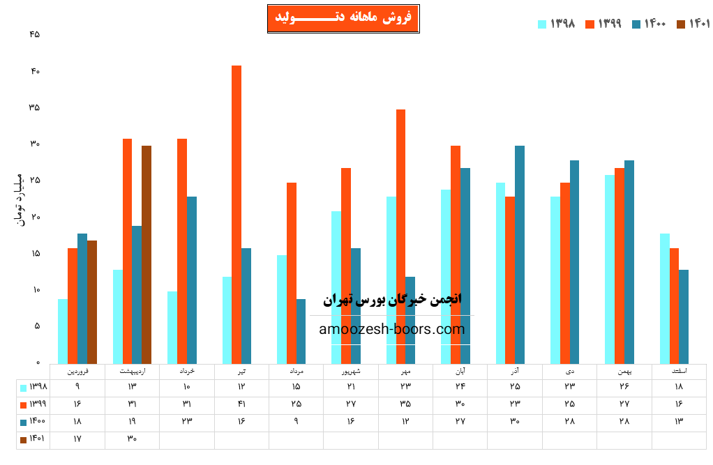 نماد دتولید در فروردین ماه سال ۱۴۰۱ حدود مبلغ ۱۷ میلیارد تومان درآمد داشته که این میزان در مقایسه با ماه گذشته ۳۱ % رشد و همچنین در مقایسه با مدت مشابه سال گذشته ۶ % کاهش درآمد را تجربه کرده است.
