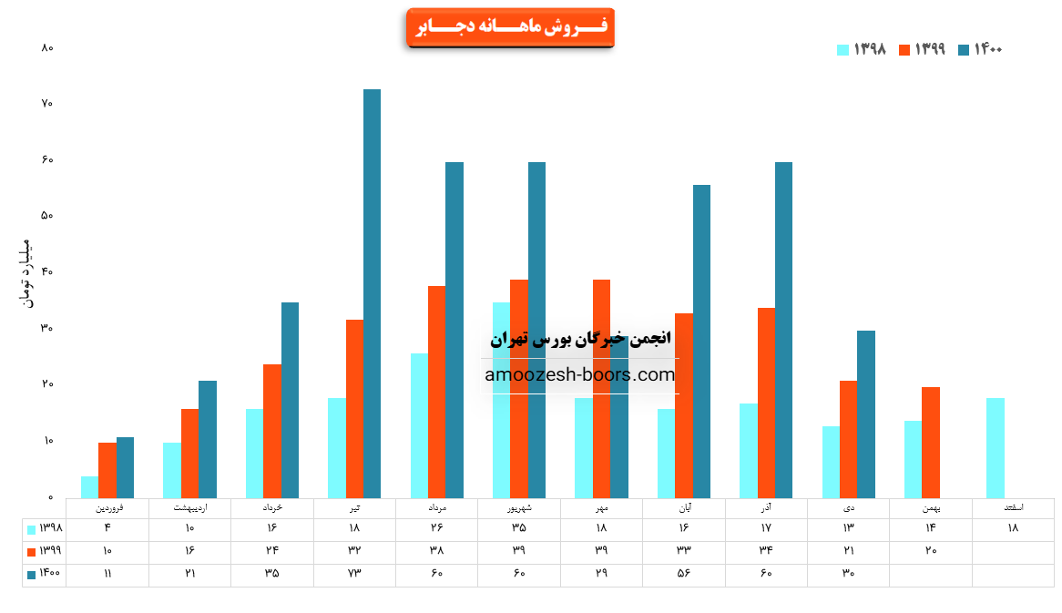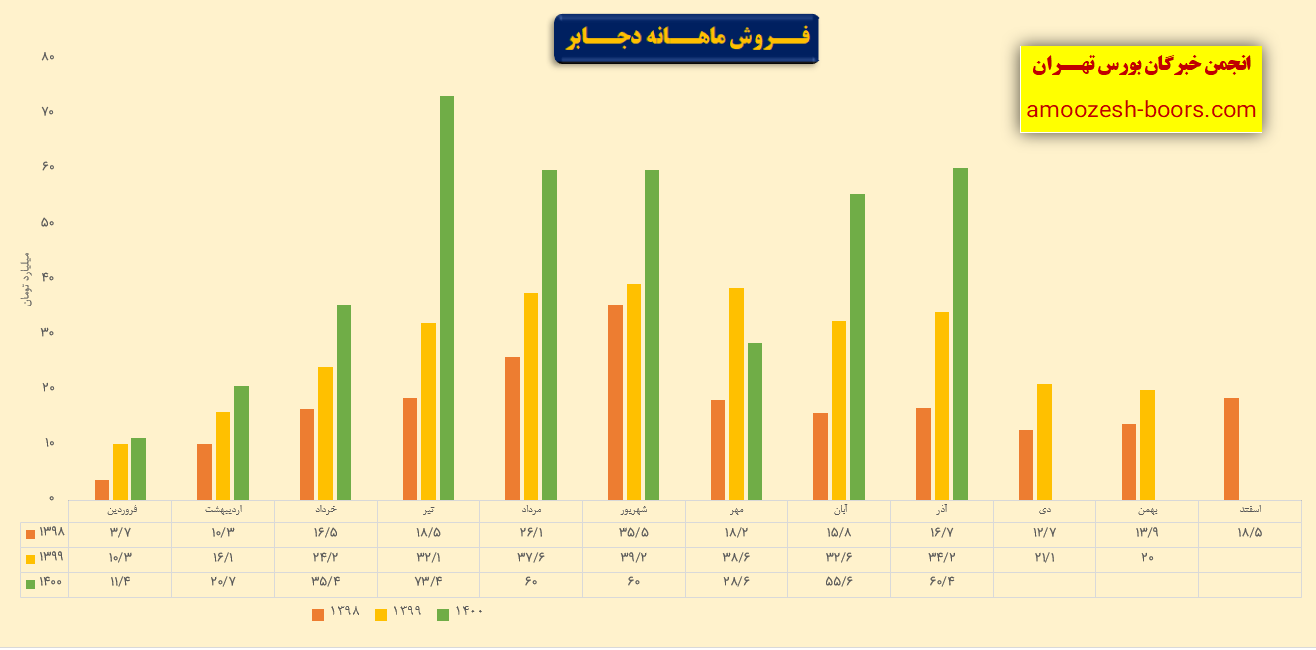 نماد دجابر در فروردین کمترین میزان فروش، 11 میلیارد و درتیر بیشترین میزان فروش، 73 میلیارد را ثبت کرده است