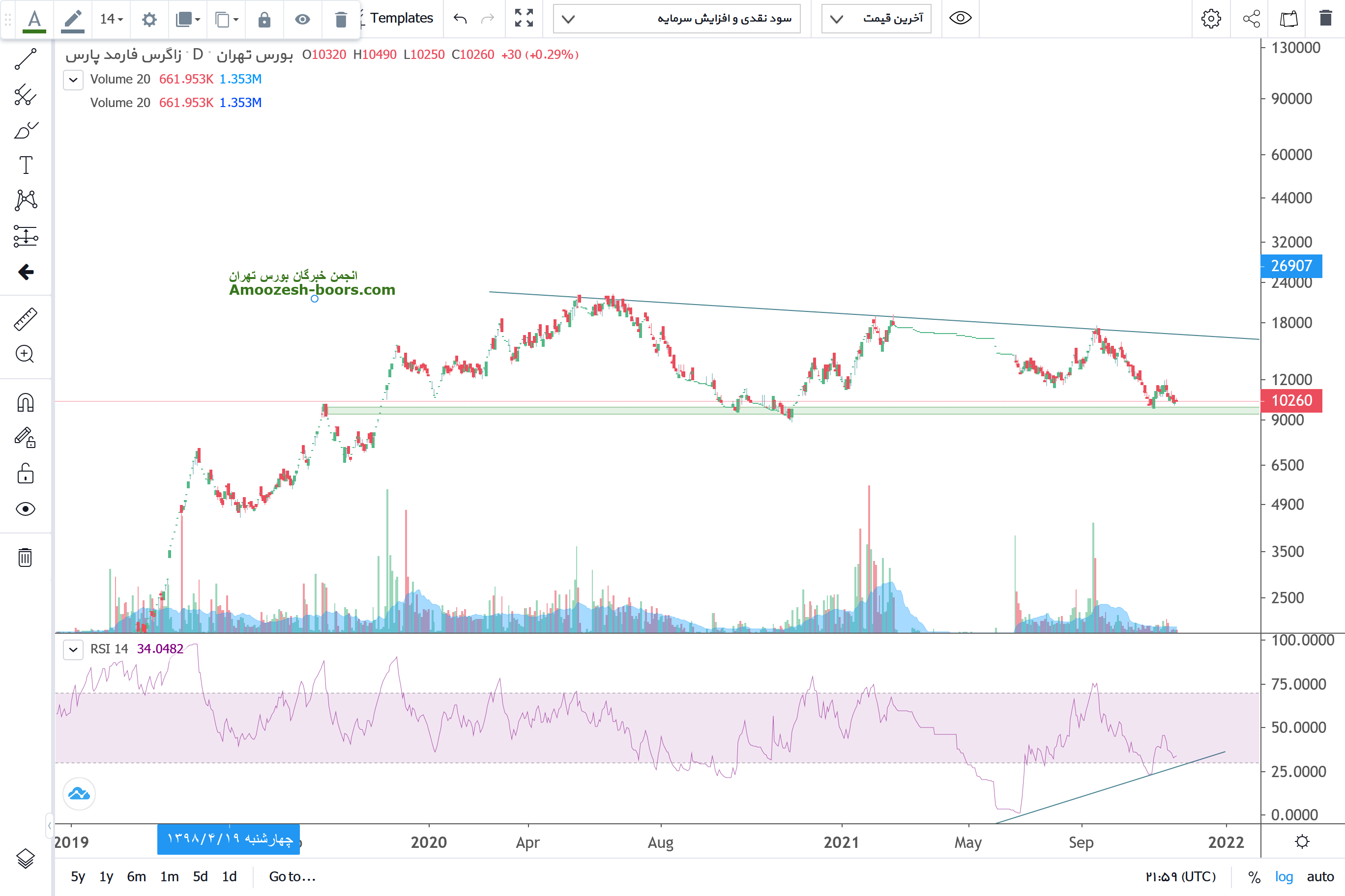 قیمت سهم ددام با ایجاد واگرایی مثبت در منطقه حمایتی پی آر زد از تلاقی حنایت استاتیک و دره قیمتی قبلی و حمایت روانی عدد رند 10000 واکنش مثبت نشان داده و میتوان با در نظر داشتن مقاومت 12000 تارگت سقف مقاومت داینامیک نزولی محدوده 16000 مورد بررسی قرار گیرد.همچنین در صورت از بین رفتن حمایت قیمتی دره قبلی،سیگنال خروج صادر و حد ضرر سهم ددام فعال خواهد شد .