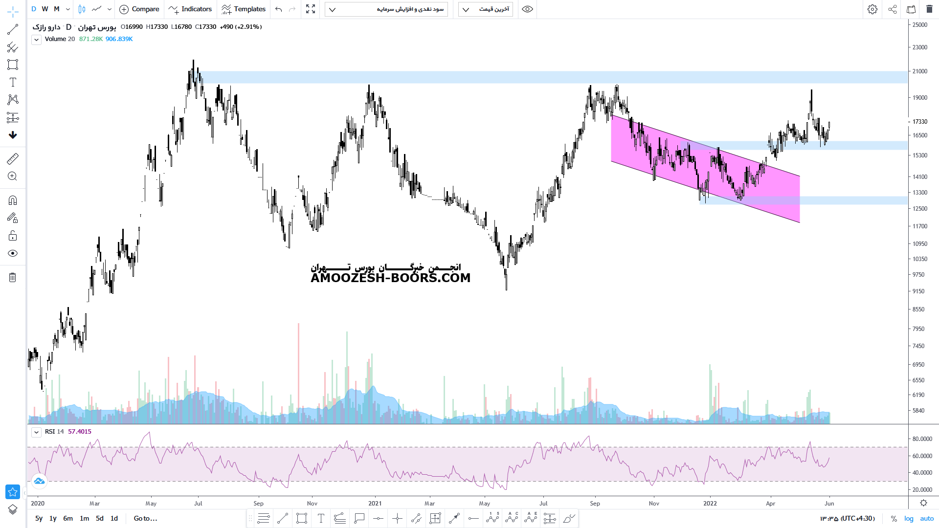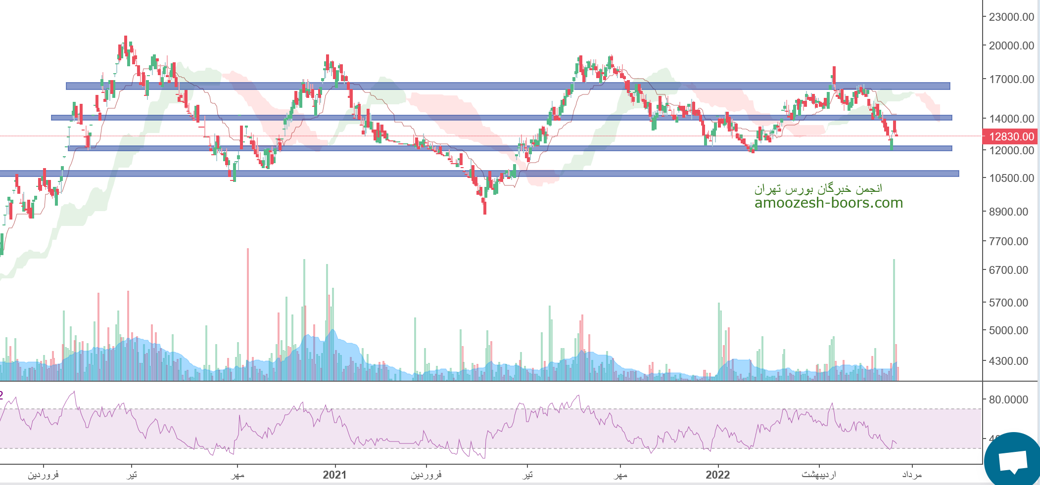 سهم درازک بین محدوده حمایتی و مقاومتی 12000 و 14000 ریال در نوسان میباشد،در صورت عبور از مقاومت،حرکت قیمت تا 16500 ریال دور از ذهن نخواهد بود،همچنین در صورت از دست رفتن حمایت حد ضرر سهم درازک فعال میگردد.