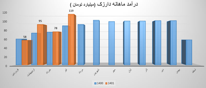 سهم درازک در مرداد مبلغ 157.1 میلیارد تومان درآمد داشته است که نسبت به ماه قبل 31% افزایش و نسبت به میانگین ماه های قبل 79% افزایش داشته است.