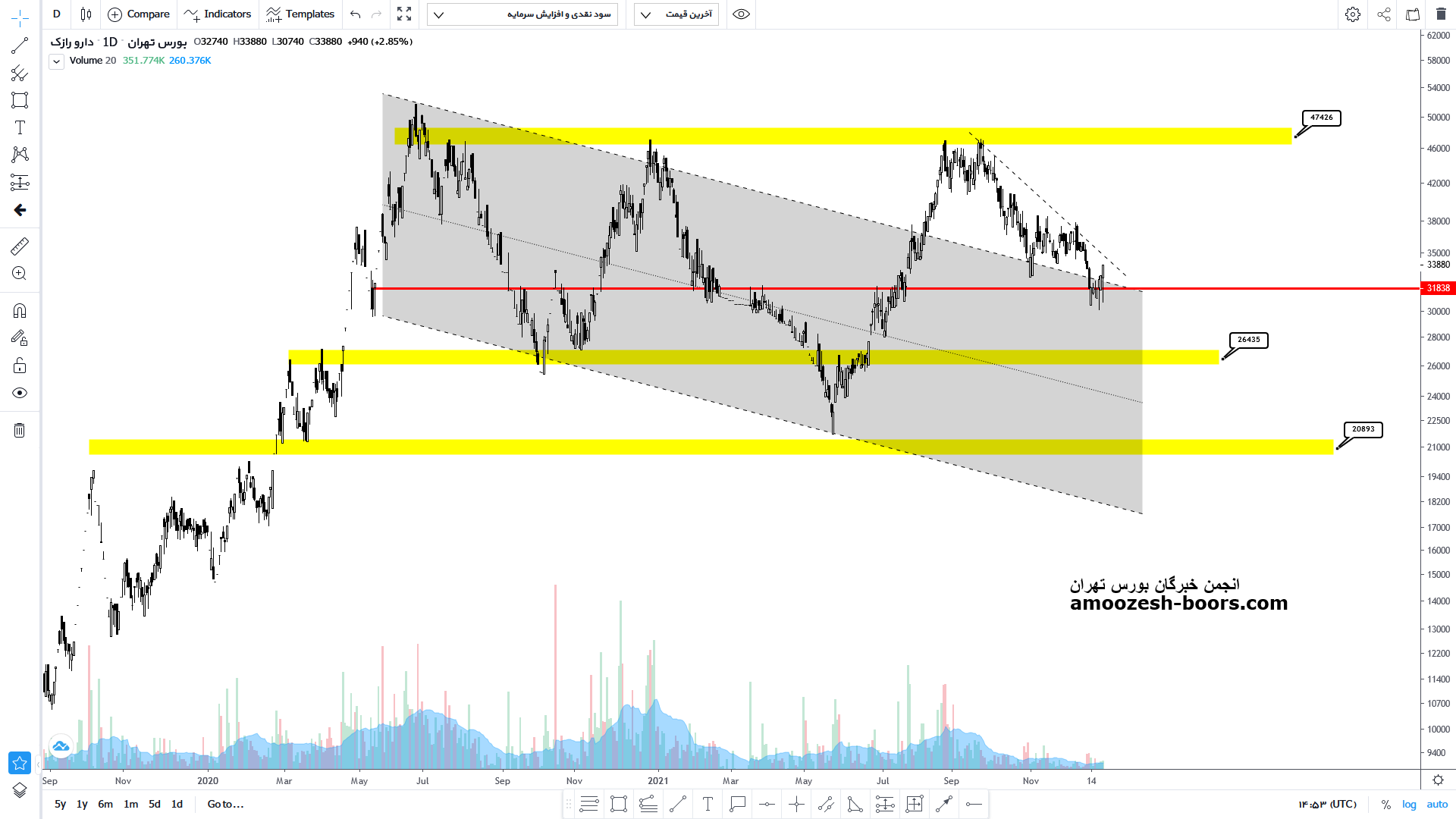 اما در صورت عدم حمایت سهم درازک در این محدوده و برگشت به درون کانال نزولی قیمت میتواند تا محدوده حمایتی 2500 تومان نیز نزول خود را دامه دهد.