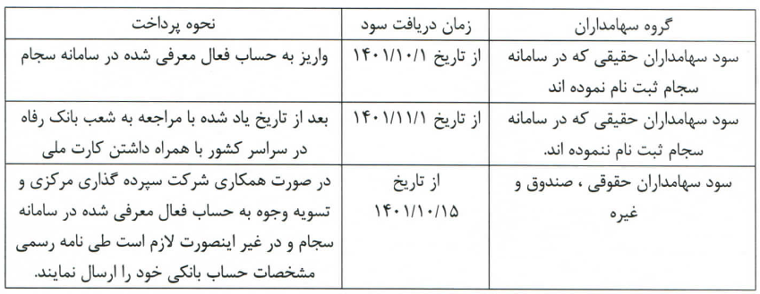 جدول زمانبندی پرداخت سود به سهامداران محترمی که در تاریخ مجمع عمومی عادی سالیانه مورخ 1401/04/01 سهامدار سهم درهاور بوده اند به شرح ذیل خواهد بود: