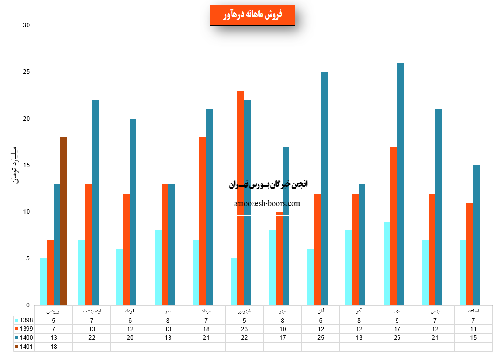 سهم درهاور در فروردبن ماه 1401 حدود مبلغ 18 میلیارد تومان درآمد داشته که این میزان در مقایسه با ماه گذشته 20% و همچنین در مقایسه با مدت مشابه سال گذشته 38% رشد درآمد پیدا کرده است.