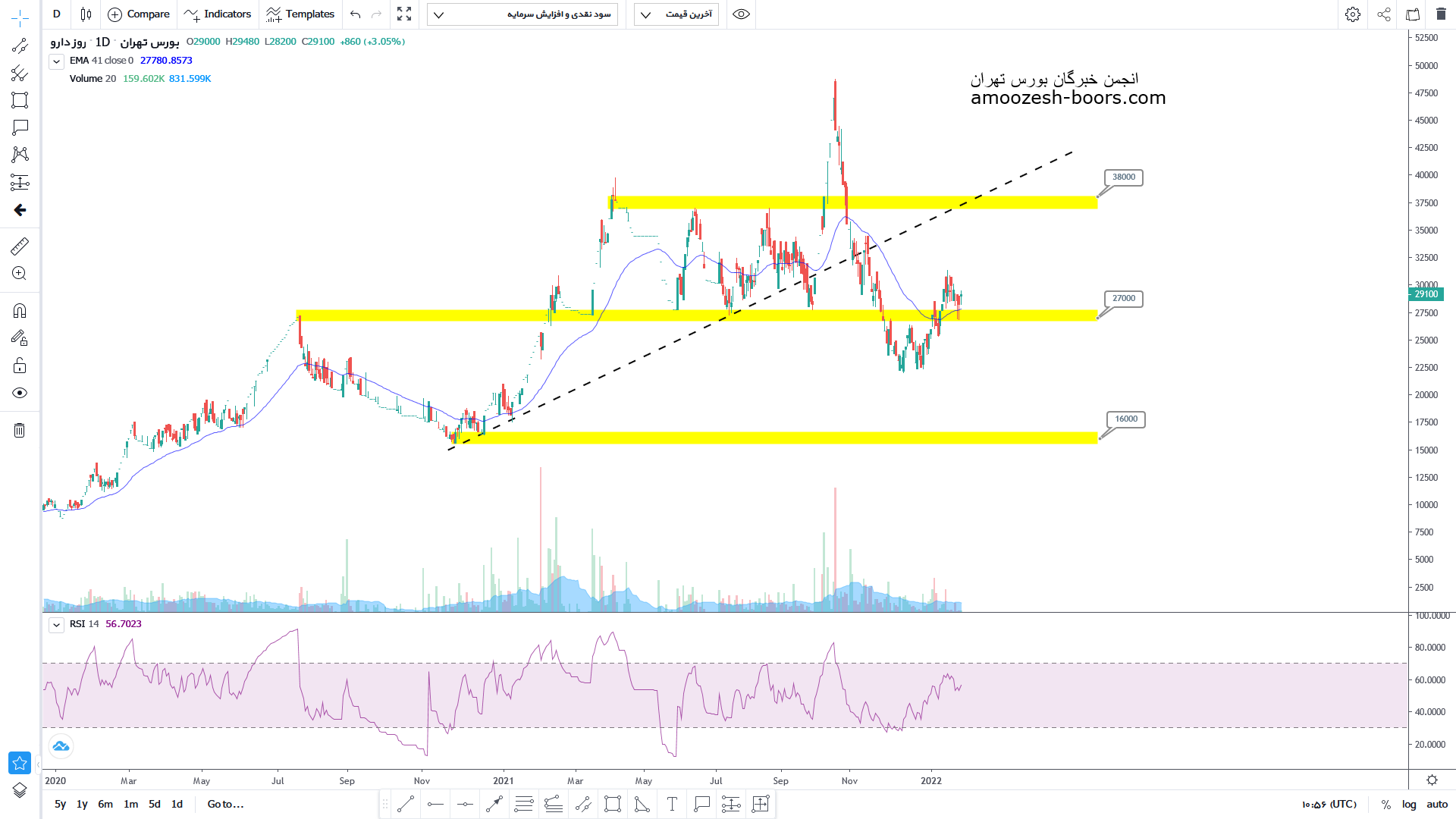 قیمت سهم دروز بعد از برخورد به کف حمایتی به سمت تارگت عدد رند و روانی 30000 ریال در حال حرکت است و تلاقی دو مقاومت سنگین داینامیک و استاتیک را بر سر راه خود دارد و در صورت اصلاح حمایت سهم 22000 ریال خواهد بود.