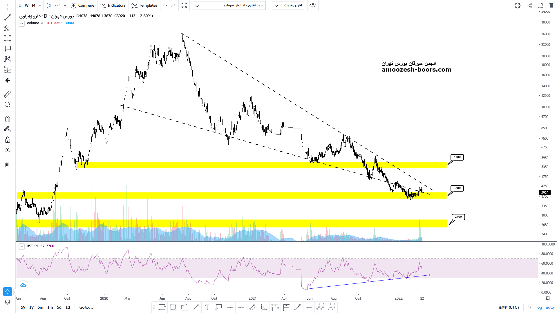 قیمت سهم دزهراوی پس از خروج و شکست کف الگوی اصلاحی خود به محدوده حمایتی ۳۸۰ تومان رسیده است و حدود ۴۵ روز درگیر با این محدوده می باشد که در صورت عبور از این محدوده پرتراکم و شکست خط روند نزولی خود میتواند سیگنال ورود صادر کرده رشد خود را تا حدود ۵۵۰ تومان ادامه دهد اما در صورت از دست رفتن این حمایت مهم مقصد موج نزولی محدوده حمایتی ۲۷۰ تومان می باشد.