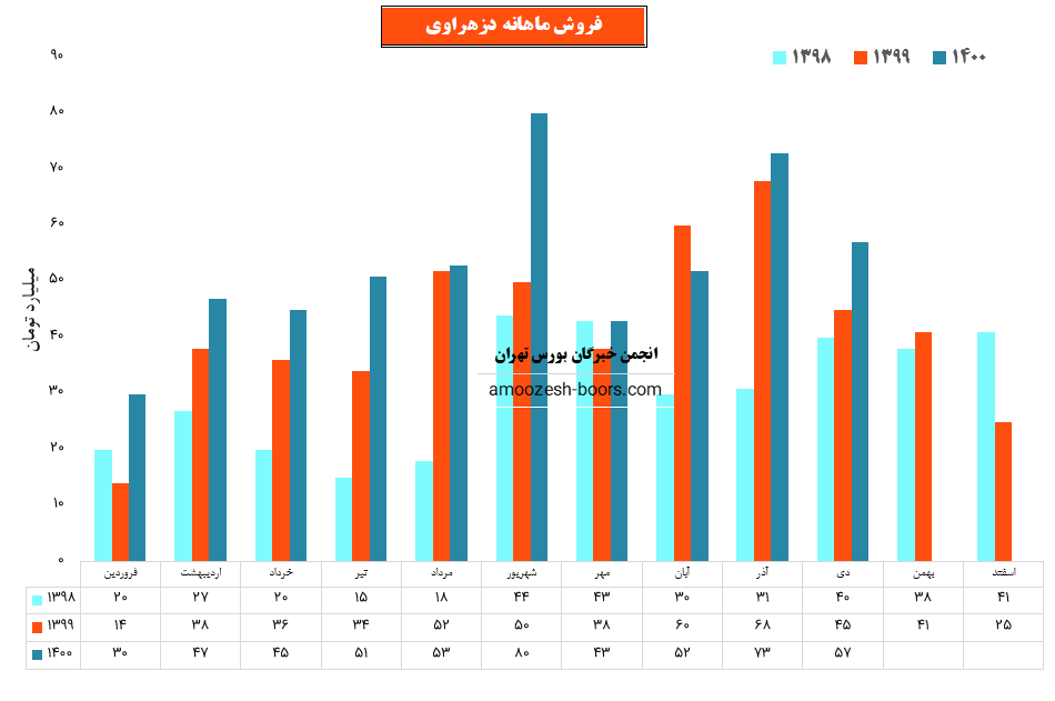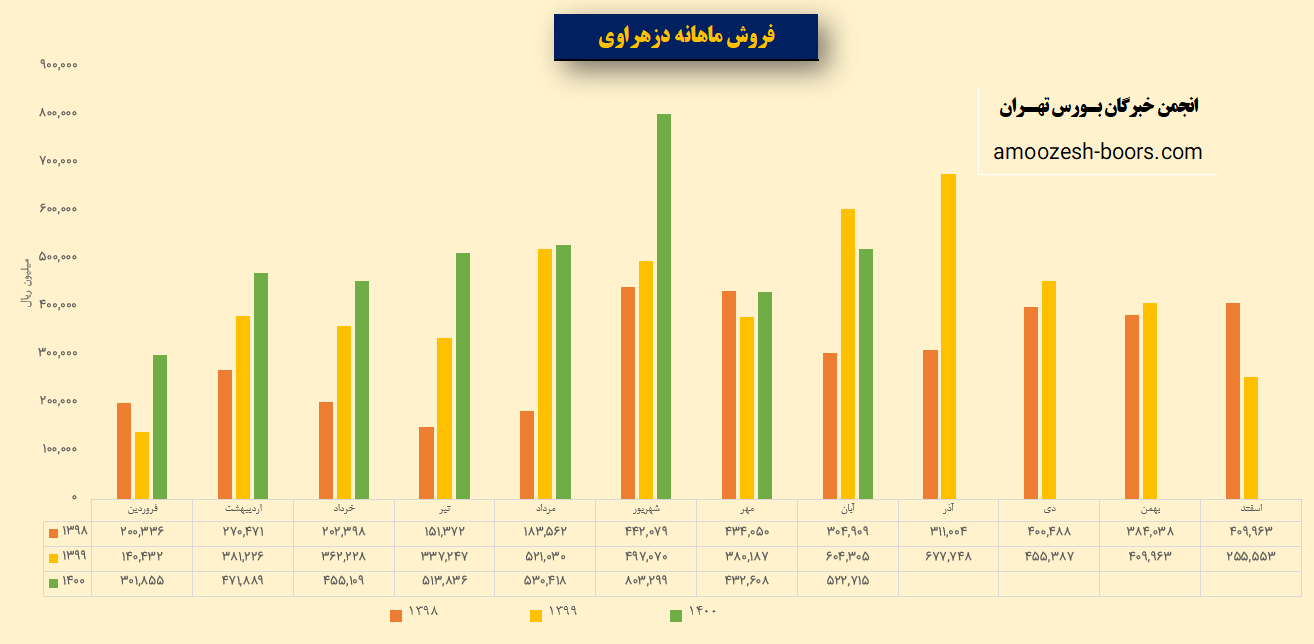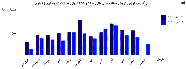 سهم دزهراوی در آبان 1400 مبلغ 52 میلیارد تومان فروش داشته که نسبت به ماه گذشته 21% افزایش و نسبت به مدت مشابه سال گذشته 14% کاهش فروش داشته است.