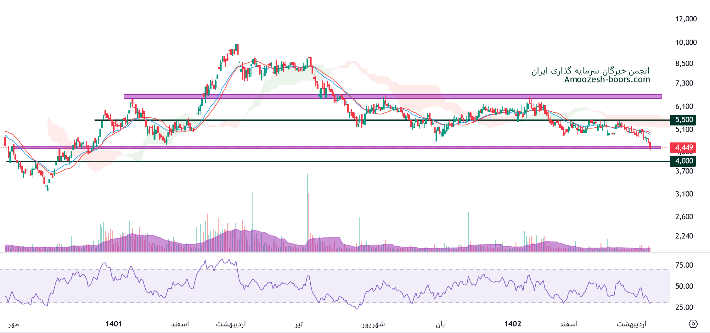 نماد دسانکو که متاثر از جو منفی کل بازار کاماکان در فاز اصلاحی به سر میبرد، در حال حاضر به محدوده حمایتی رسیده، باید منتظر طرز واکنش قیمت به این محدوده حمایتی ماند ( حمایت دسانکو 4400 ریال میباشد )، همچنین در صورت از دست رفتن این حمایت، حمایت بعدی نماد دسانکو 4000 ریال ارزیابی میگردد، در صورت تثبیت قیمت در این محدوده، اولین مقاومت سهم دسانکو محدوده 5500 ریال در نظر گرفته خواهد شد.