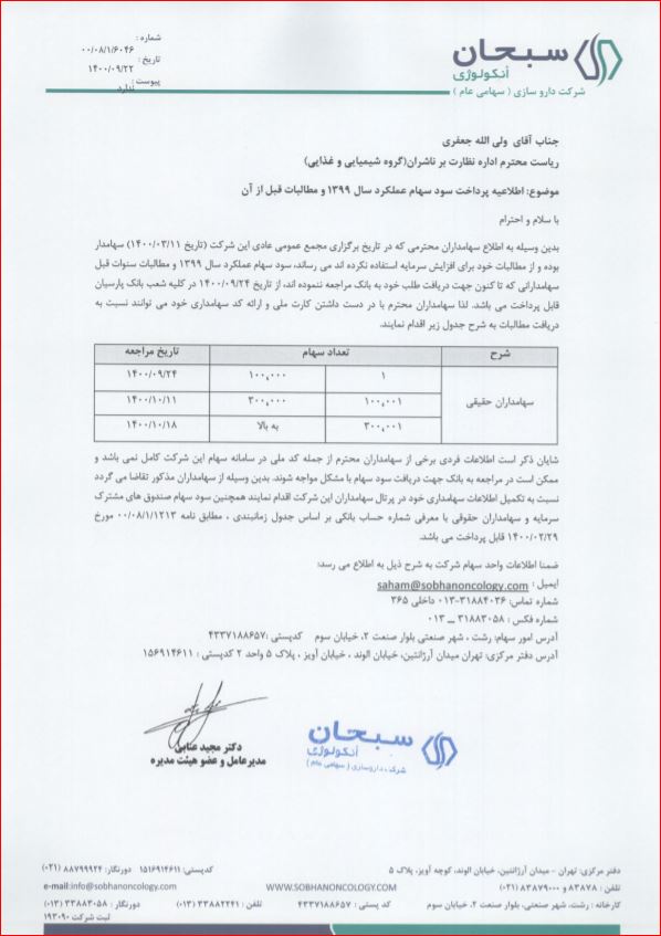 با توجه به برگزاری مجمع عادی سالیانه در تاریخ 11 خرداد 1400 سهامداران میتوانند سود سهام خود را (باتوجه به تعداد سهام) از تاریخ 24 آذر 1400 با مراجعه به کلیه شعب بانک پارسیان نسبت به دریافت سود تقسیمی اقدام کنند.
