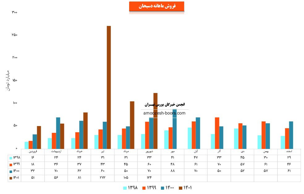 سهم دسبحان در دوره یک ماهه منتهی به 31 مرداد ماه 1401، مبلغ 105.2 میلیارد تومان درآمد داشته است که نسبت به ماه قبل 24% افزایش و نسبت به میانگین ماه های قبل 55% افزایش و  نسبت به دوره 1 ماهه مشابه سال قبل 110% افزایش درآمد داشته است.