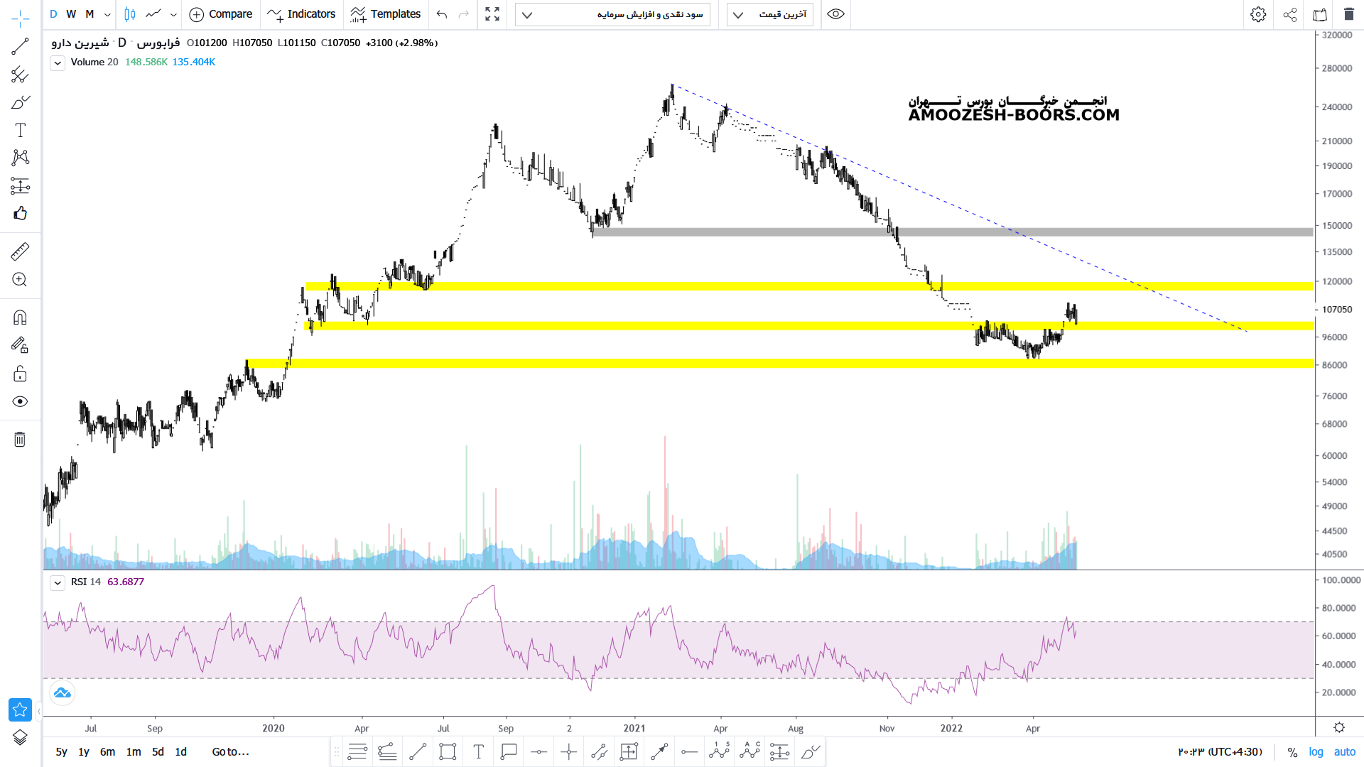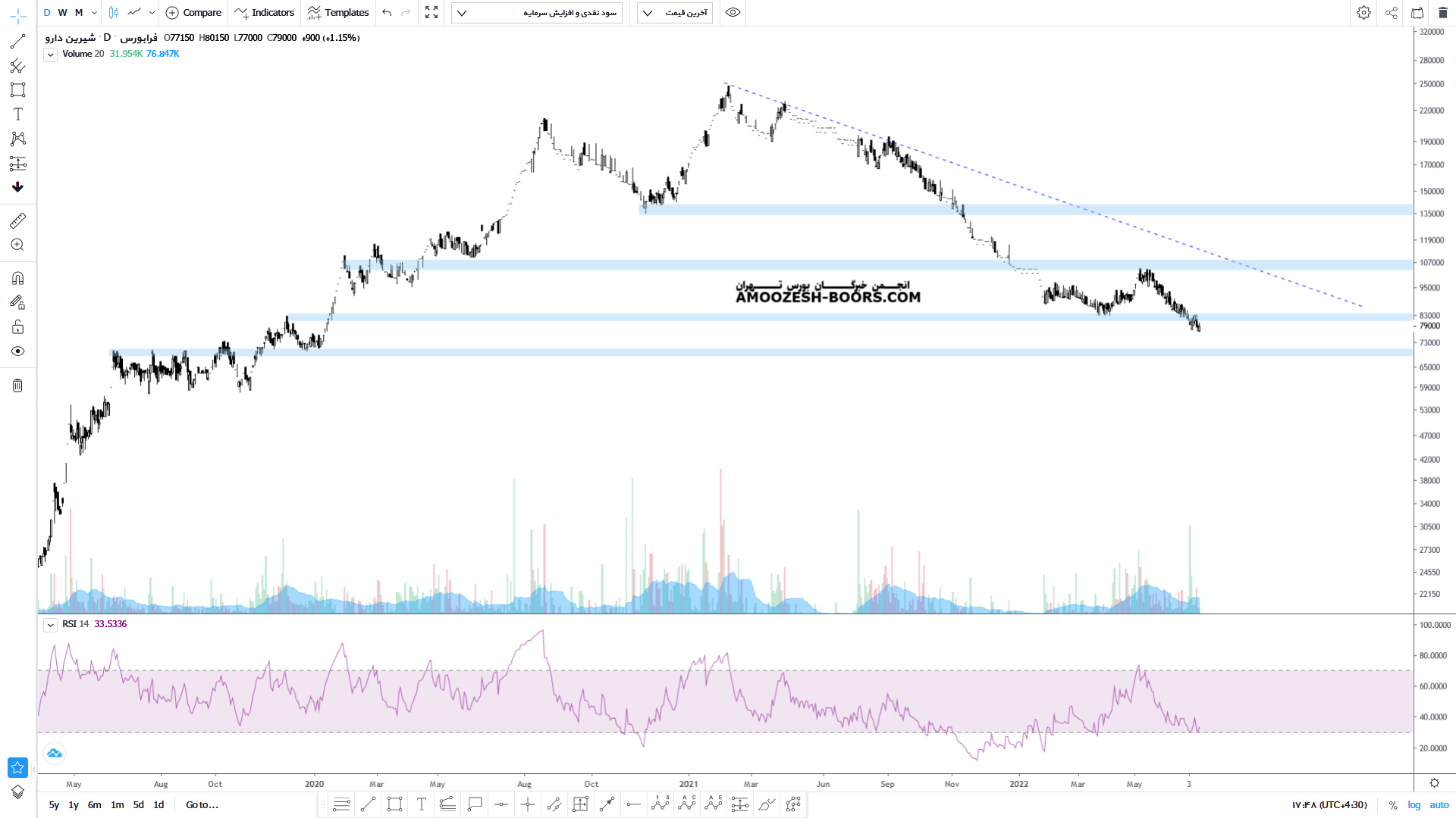 قیمت سهم دشیری در موج اصلاحی خود با افزایش مومنتوم نزولی اکنون بر روی محدوده حمایتی 11500 تومان قرار دارد که درصورت حمایت و برگشت از این محدوده انتظار رشد برای این نماد تا محدوده مقاومت 14500 تومان میرود و در صورت عدم حمایت،سیگنال خروج صادر و انتظار اصلاح بیشتر تا محدوده حمایت 10000 تومان از سهم میرود