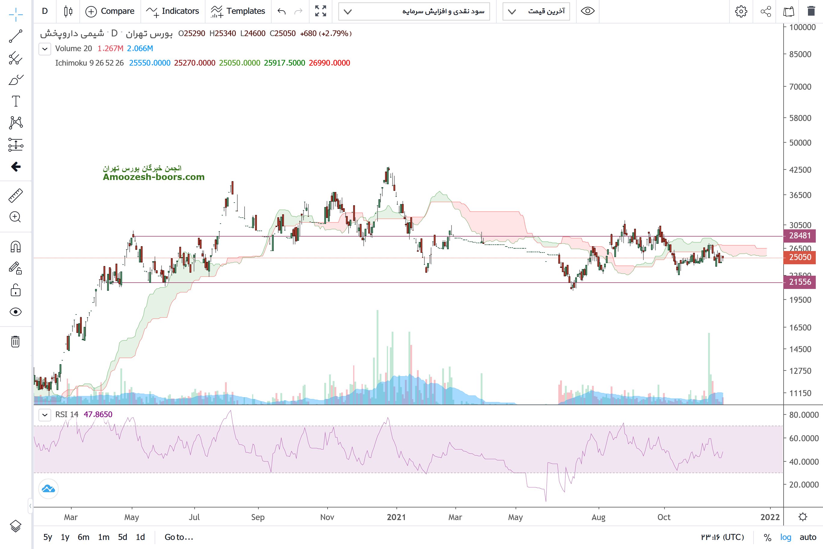 سهم دشیمی با توجه به مومنتوم ضعیف حرکتی چارت، ادامه روند خنثی محتمل بوده در حال حاضر قیمت درگیر مقاومت ابر کومو بوده و در صورت شکست این مقاومت هم سطح 29000 موجب شده تا مقاومت ریسک به ریوارد جذاب بنظر نرسد .