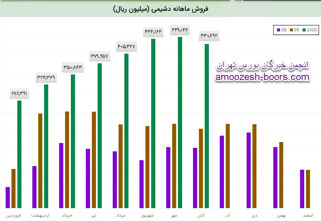 مقدار فروش سهم دشیمی در مرداد 42113 کیلوگرم بوده که با 10 درصد افزایش، به 46325 کیلوگرم در شهریور رسیده که 10 درصد آن به صورت صادرات بوده است.