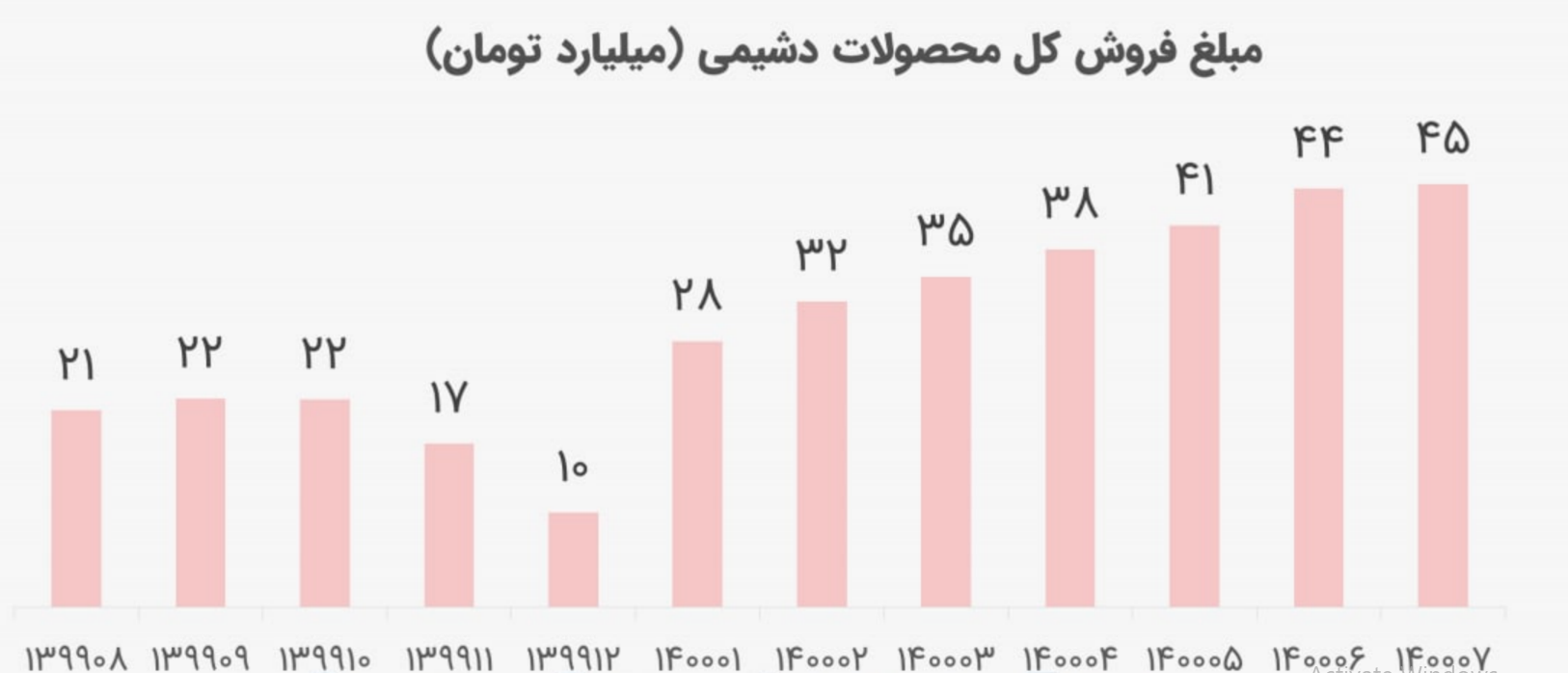 سهم دشیمی در تیرماه فروش خب 38 میلیاردی داشته است. در خرداد و اردیبهشت هم فروش 35 و 32 میلیاردی و فروردین ماه فروش 28 میلیارد تومانی داشته است. متوسط فروش 12 ماه سال مالی گذشته شرکت 20 میلیارد تومان بوده است