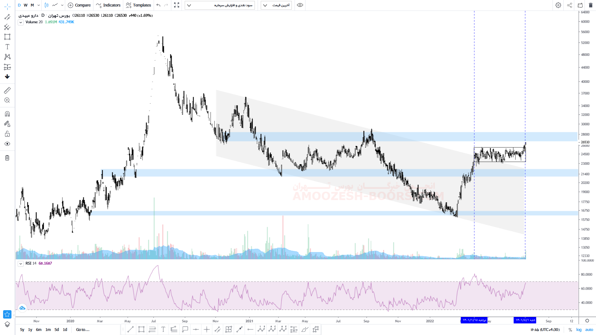 سهم دعبید در حال حاضر مقاومت 30000 ریال را دارا میباشد، در صورت عبور از مقاومت حرکت سهم تا 34500 ریال دور ازذهن نخواهد بود، همچنین در صورت اصلاح، اولین حمایت سهم 26000 ریال در نظر گرفته خواهد شد که در اینصورت حد ضرر سهم دعبید فعال میگردد.