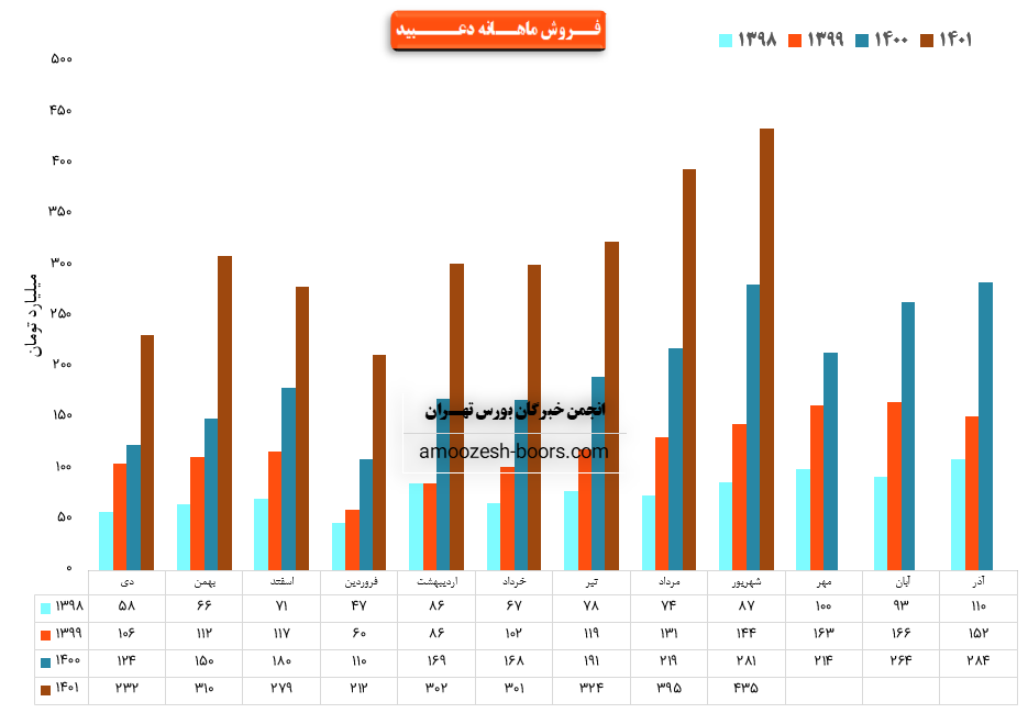 سهم دعبید در شهریور ماه حدود بیش از 4/400/000 عدد از محصولات خود را به فروش رسانده که این میزان در مقایسه با حجم فروش ماه گذشته خود حدود 7% افزایش پیدا کرده است.