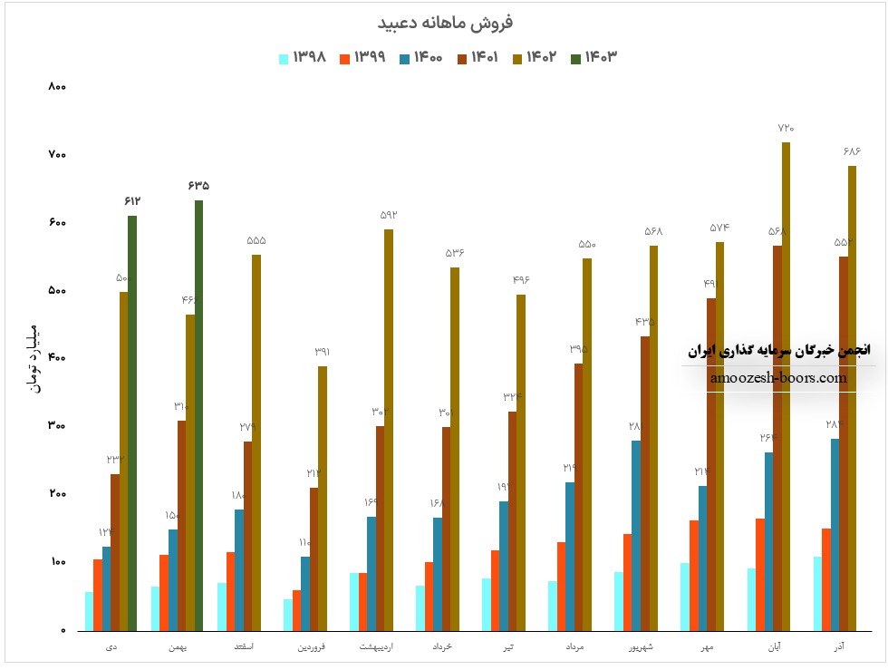 دعبید در اسفند ماه از طریق فروش داخلی به فروش 757.3 میلیارد تومانی دست یافت.