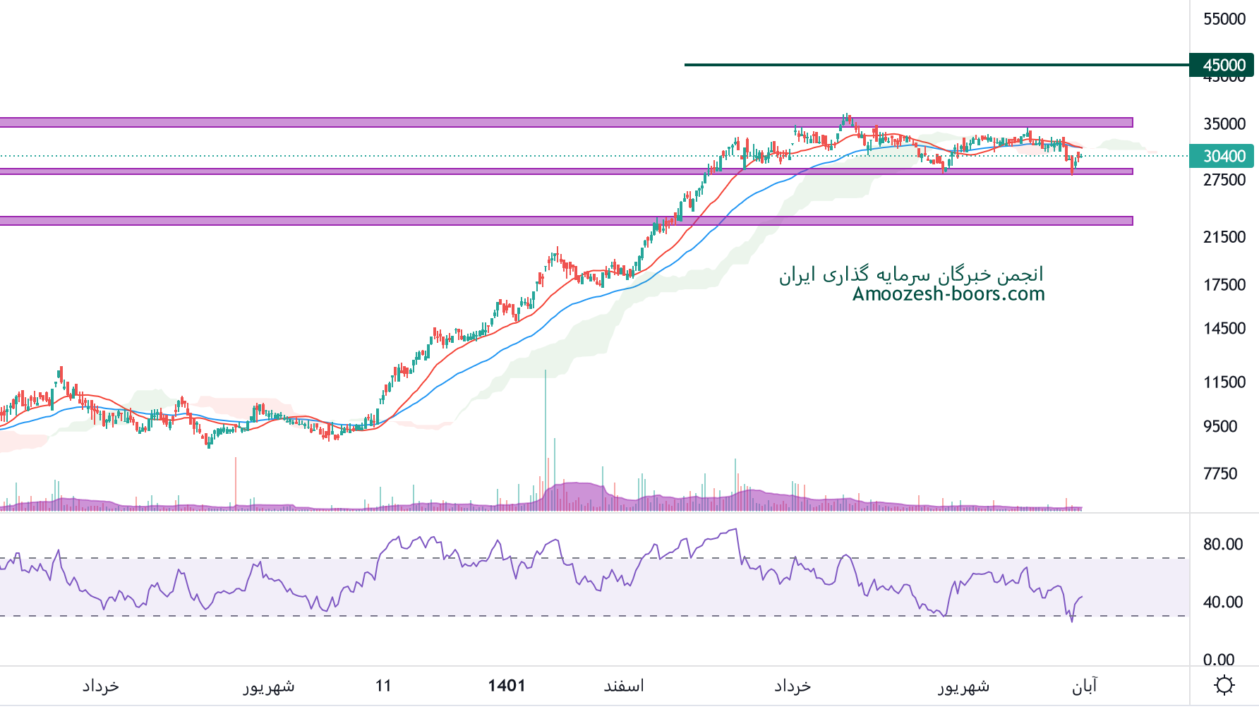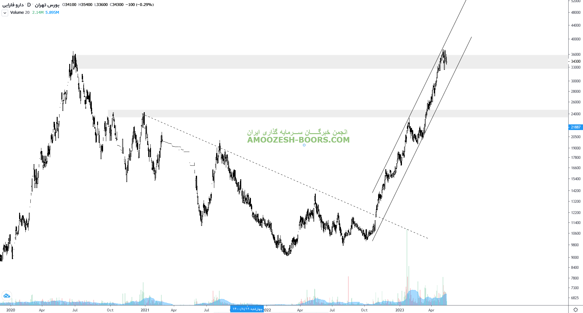 در بررسی نمودار تکنیکال نماد دفارا، قیمت سهم درگیر محدوده مقاومتی 35000 ریال میباشد، در صورت عبور قیمت از این محدوده، مقاومت بعدی دفارا محدوده 40000 ریال در نظر گرفته خواهد شد، همچنین در صورت ورود قیمت به فاز اصلاحی، اولین حمایت سهم دفارا، 23000 ریال خواهد بود.