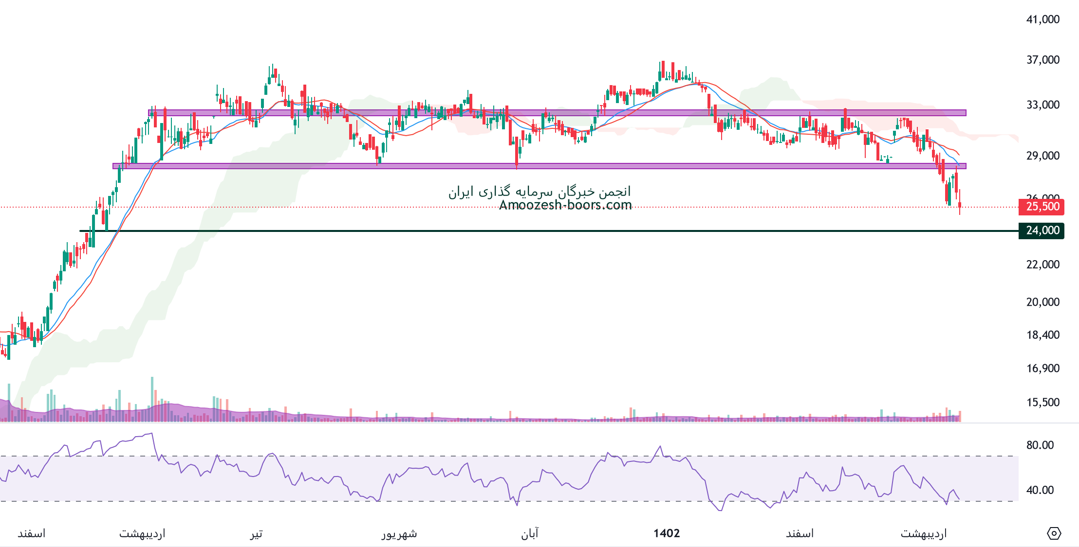 نماد دفارا محدوده حمایتی 28000 ریال را دارا میباشد، در صورت تثبیت و بیس سازی قیمت در این محدوده، حرکت سهم به ترتیب تا محدوده های 35000 و 45000 ریال محتمل خواهد بود، همچنین در صورت از دست رفتن محدوده حمایتی ذکر شده، حمایت بعدی سهم دفارا محدوده 23000 ریال در نظر خواهد شد.