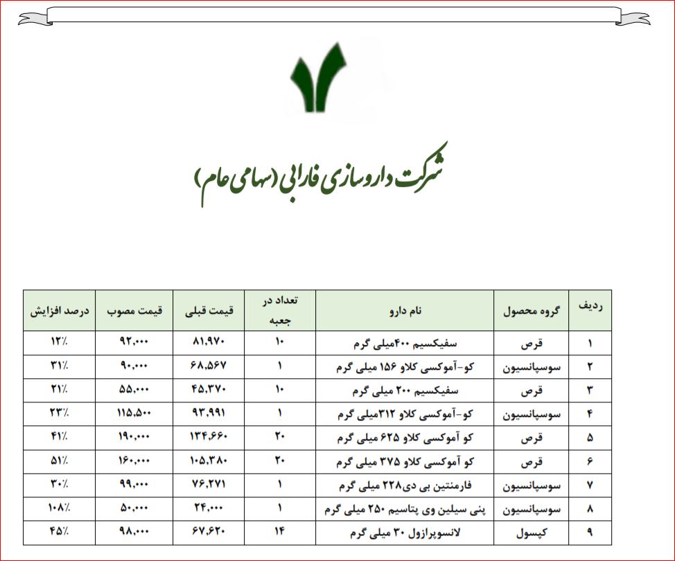 - شرکت دارو سازی فارابی طی اطلاعیه ای دلیل کاهش فروش و افت سودآوری نسبت به دوره مشابه گذشته را کاهش تقاضای بازار از یک سو و از سوی دیگر افزایش نرخ مواد اولیه محصولات دانسته است، شرکت خاطر نشان کرد که در حال انجام اقدامات لازم جهت اخذ مجوز افزایش نرخ فروش میباشد