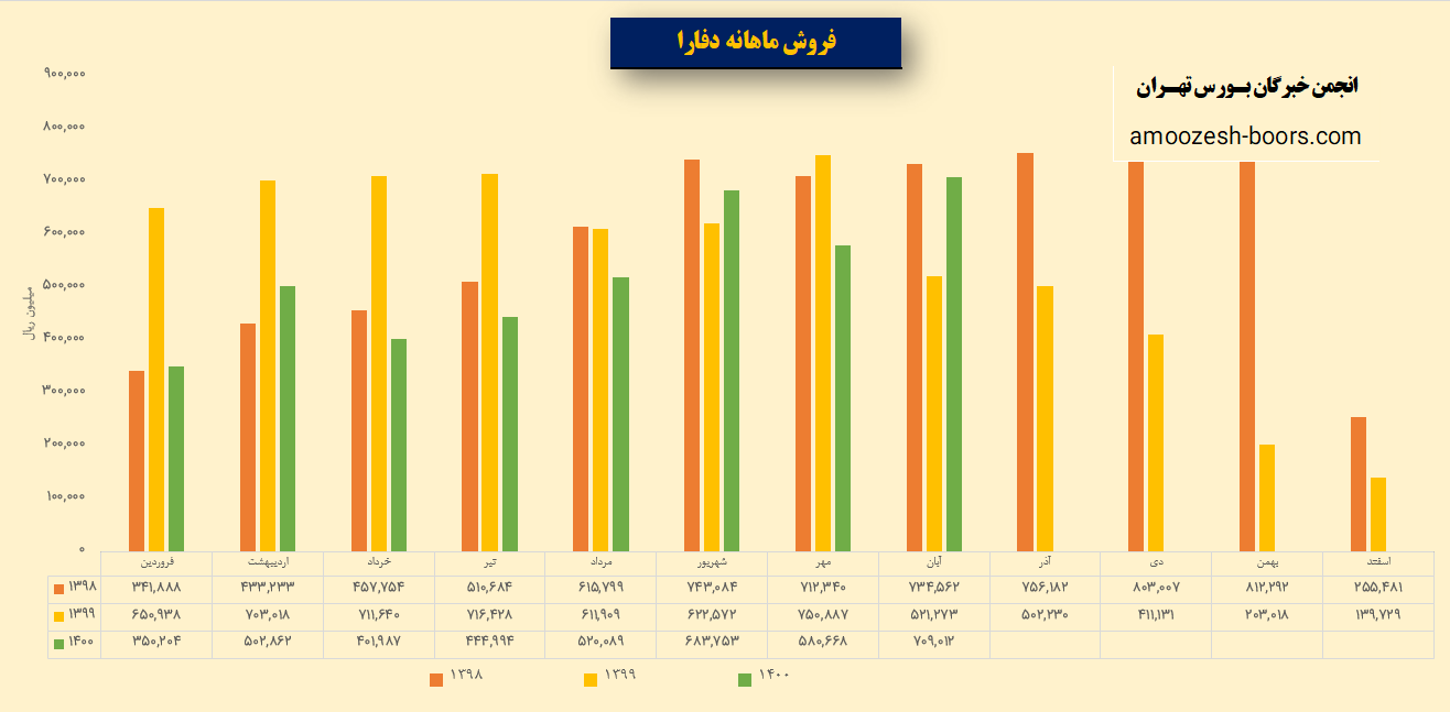 اگرچه سهم دفارا عملکرد ضعیف خود را که از ابتدای سال شروع کرده بود رفته رفته با افزایش حجم فروش بهبود بخشید و از فروش ماهانه 35 میلیارد تومان در فروردین به 71 میلیارد تومان در ابان رساند اما در مقایسه با سال قبل نتوانسته عملکرد بهتری داشته باشد