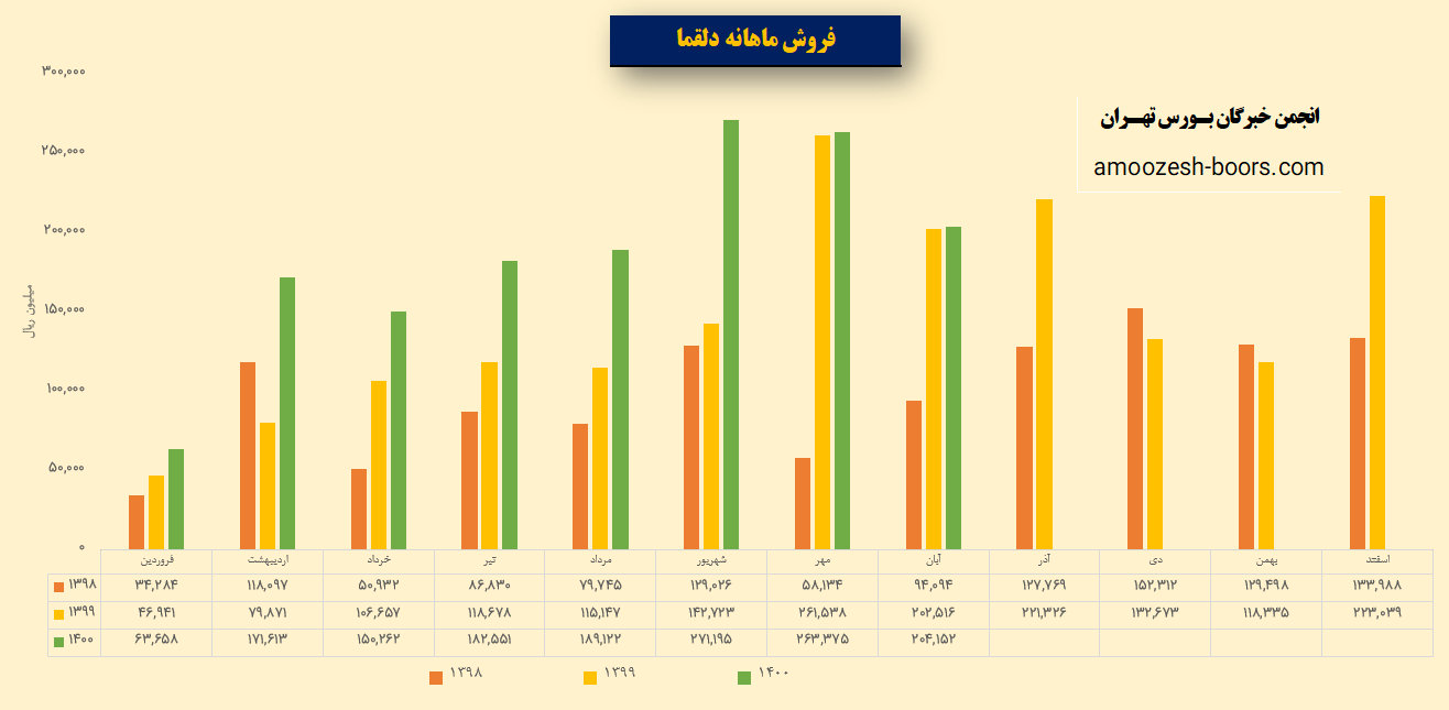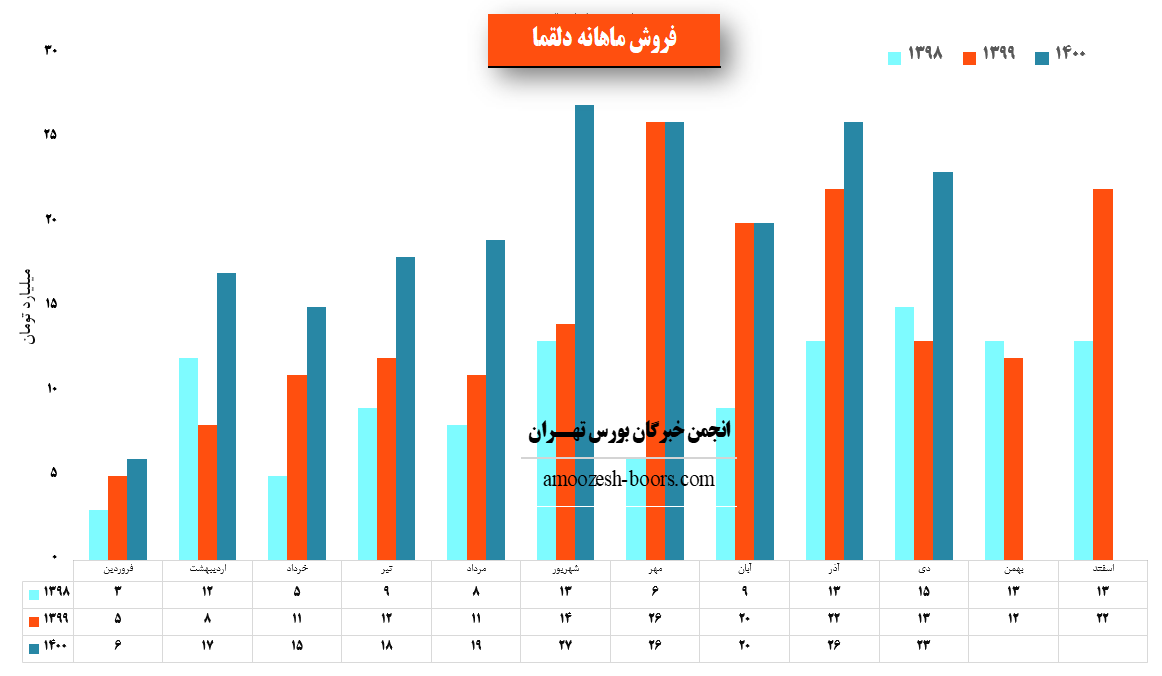 - 184 میلیارد تومان مبلغی است که سهم دلقما برای 6 ماهه دوم 1400 پیشبینی فروش کرده است که نسبت به 6 ماهه اول سال 80% افزایش فروش پیشبینی شده است، لازم به ذکر است که این میزان افزایش فروش مربوط به افزایش میزان فروش پیشبینی شده و نه افزایش نرخ فروش